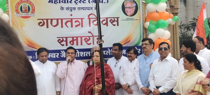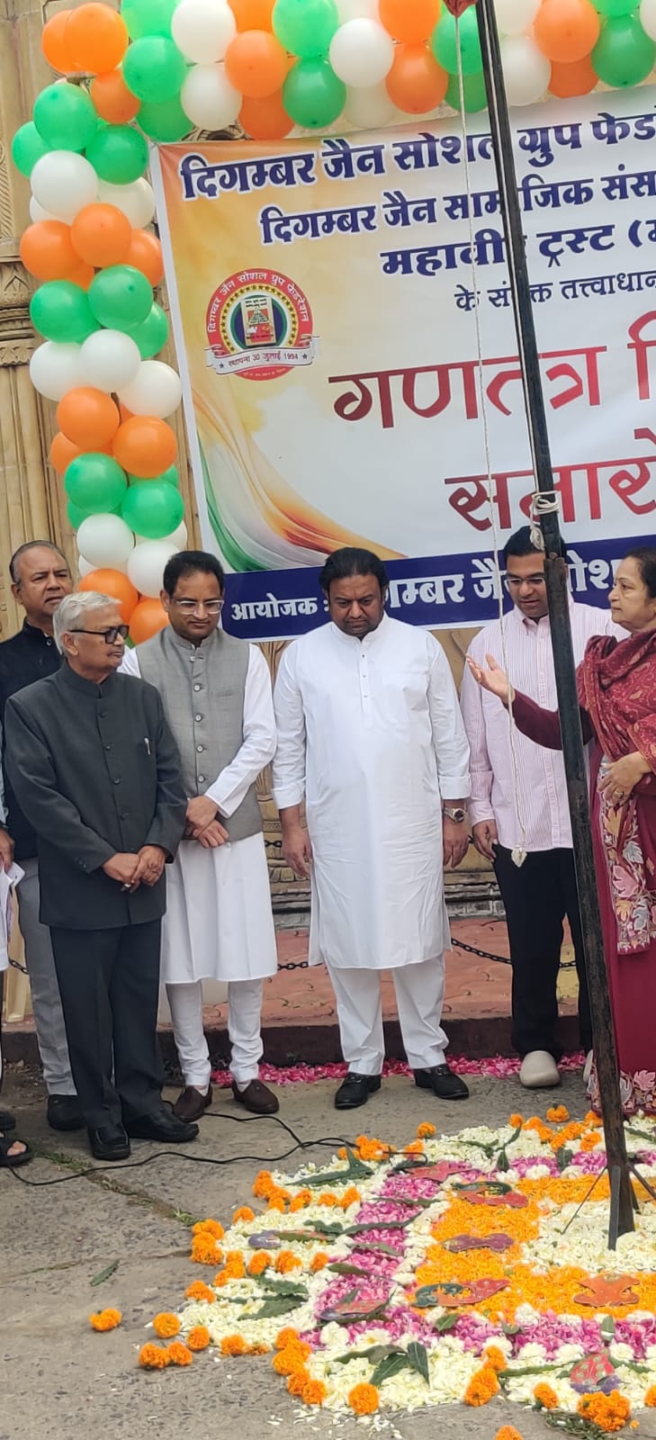 77वें गणतंत्र दिवस पर एमजी रोड स्थित कीर्ति स्तंभ परिसर में महावीर ट्रस्ट, दिगंबर जैन सोशल ग्रुप फेडरेशन एवं दिगंबर जैन समाज सामाजिक संसद ने संयुक्त रूप से उमंग एवं उत्साह के साथ गणतंत्र दिवस मनाया। मुख्य अतिथि मोटिवेशनल स्पीकर स्वप्निल कोठारी एवं प्रसिद्ध हीरा व्यवसायी गोलू जैन बदलिया कोलकत्ता ने ध्वजारोहण किया एवं राष्ट्रगान एवं देश भक्ति गीत की स्वर लहरियां श्रीमती रागिनी जैन ने गूंजायमान की जिससे पूरा परिसर राष्ट्र भक्ति के रंग में सरोबार हो गया। समारोह में श्रीमती अलका जैन ने गणतंत्र दिवस(ग से लेकर स तक) के प्रत्येक शब्द की व्याख्या करते हुए उसमें छुपी भावनाओं एवं संदेशों को उद्घाटित किया जिसे लोगों ने बहुत सराहा) फेडरेशन के मिडिया प्रभारी राजेश जैन दद्दू ने बताया कि इस अवसर पर स्वप्निल कोठारी ने समारोह को संबोधित करते हुए कहा कि उत्कृष्टता कीआकांक्षा को महत्वाकांक्षा से बचाने के लिए संविधान जरूरी होता है। कितने भी वर्ष बीत जाए राइट एवं रांग नहीं बदलता राइट और रांग रामायण एवं महाभारत काल में भी वही था और आज भी वही है। आपने उपस्थित समाज जनों से अपील की कि महत्वकांक्षी लोगों को पहचाने और उनसे समस्त सामाजिक प्लेटफार्म (संस्थाओं)को बचाएं और उत्कृष्टता के आकांक्षी लोगों को आगे लाऐं। गोलू जैन बदलिया ने कहा कि राष्ट्र के विकास में जैन समाज का बहुमूल्य अवदान है। आपने भी समाज से आह्वान किया कि हम सबका कर्तव्य है कि हम राष्ट्र एवं समाज के संविधान का सम्मान करें और अपने संवैधानिक अधिकारों को समझते हुए उसी अनुरूप आचरण करें।