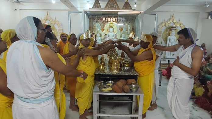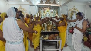 जयपुर शहर के प्रताप नगर सेक्टर 5 में 19 अक्टूबर को प्रातः काल की पावन बेला मुनी अरह सागर जी महाराज का बैंड बाजों के साथ महावीर दिगंबर जैन मंदिर में भव्य मंगल प्रवेश हुआ एवं उनके सानिध्य में वृहद शांति धारा सानंद सम्पन्न हुई,इस अवसर पर महाराज श्री के सानिध्य में अभिषेक एवं 1008 मंत्रों से वृहद शांति धारा की गई। जिसके पुण्यार्जक श्री प्रवीण कुमार जैन बैंक वाले, श्री कैलाश चंद जैन मलैया, श्री संजय छाबड़ाआवा श्री प्रवीण पाटोदी परिवार,मुकेश कुमार पाटनी,श्री पवन जी नैनवा वाले परिवार रहे। इसके बाद महाराज श्री का मंगल प्रवचन हुआ जिसमें उन्होंने बताया कि इस समय जो हम धनतेरस मानते हैं वह धन्य तेरस तिथि थी, जिस दिन भगवान महावीर की दिव्या देशना खिरी थी, परंतु संसारी जीवों ने अपने मतलब की चीज अपना ली और इस दिन को धनतेरस के रूप में मानने लगे, आज के दिन जो भी जीव दान करके पुण्य कमा लेंगे उनका ही बेड़ा पार होगा कार्यक्रम में मंदिर जी के अध्यक्ष संजय छाबड़ा आंवा वाले ने सभी आगंतुक साधर्मी भाई बहनों का भव्य स्वागत किया, और मंत्री पवन कुमार नैनवा वालों ने सभी समाज जनों का आभार व्यक्त किया।