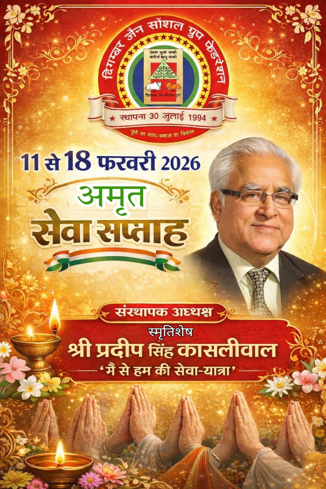 “मैं से हम की यात्रा” के प्रेरक, दिगम्बर जैन सोशल ग्रुप फेडरेशन के संस्थापक अध्यक्ष जैनरत्न स्व. श्री प्रदीप कुमार सिंह जी कासलीवाल की 78वीं जन्म-जयंती के पावन अवसर पर 11 जनवरी से 18 जनवरी 2026 तक “अमृत सेवा सप्ताह” का आयोजन किया जाएगा। यह सेवा सप्ताह प्रतिवर्ष की भाँति इस वर्ष भी सामाजिक सरोकार, मानव सेवा और समर्पण की भावना के साथ मनाया जाएगा।