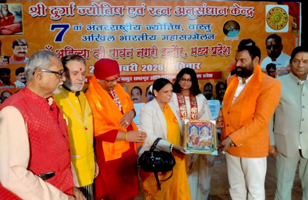 इंदौर- दिनांक 25 जनवरी,श्री दुर्गा ज्योतिष एवं रत्न अनुसंधान केंद्र द्वारा,आनंद मोहन माथुर सभाग्रह इंदौर में रविवार को सातवां अंतराष्ट्रीय ज्योतिष, वास्तु अखिल भारतीय महासम्मेलन आयोजित किया गया। देश भर से आए ज्योतिषाचार्यों ने सम्मेलन में सहभागिता की। इस अवसर पर आचार्य, ज्योतिष डॉ. विमला जैन ने ‘ज्योतिषशास्त्र में कर्मफल सिद्धांत’ पर अपने विचार रखे l डॉ. जैन ने बताया कि ज्योतिषशास्त्र का उद्देश्य केवल भविष्यवाणी करना ही नहीं है, बल्कि वर्तमान कर्म के माध्यम से प्रतिकूल प्रारब्ध की तीव्रता को कम करना भी है। यह शास्त्र बताता है कि वर्तमान कार्यों से अतीत में किए गए कार्यों के नकारात्मक प्रभावों को कम किया जा सकता है। महासम्मेलन में अनुसंधान केंद्र द्वारा डॉ जैन को सम्मानित भी किया गया।