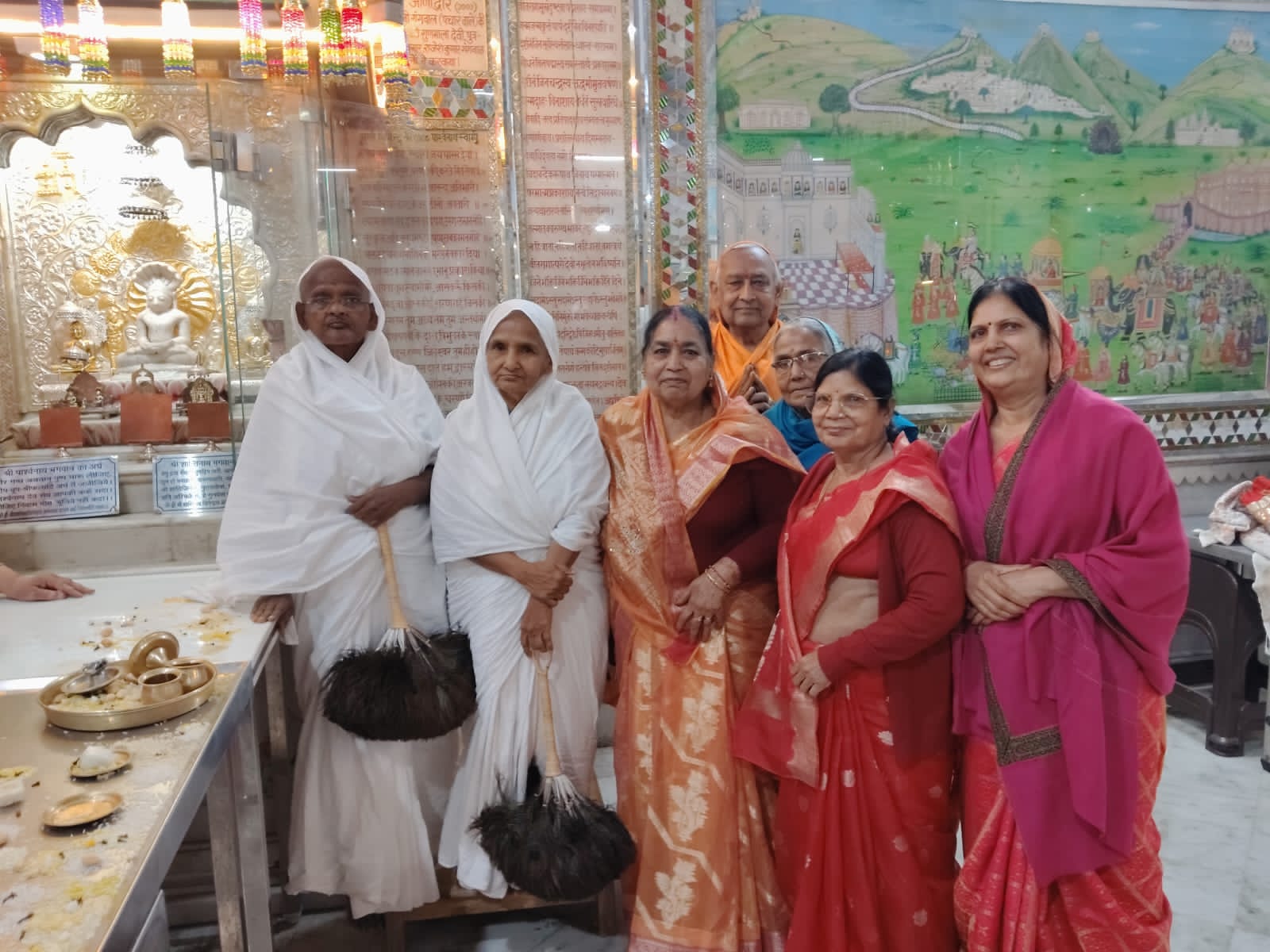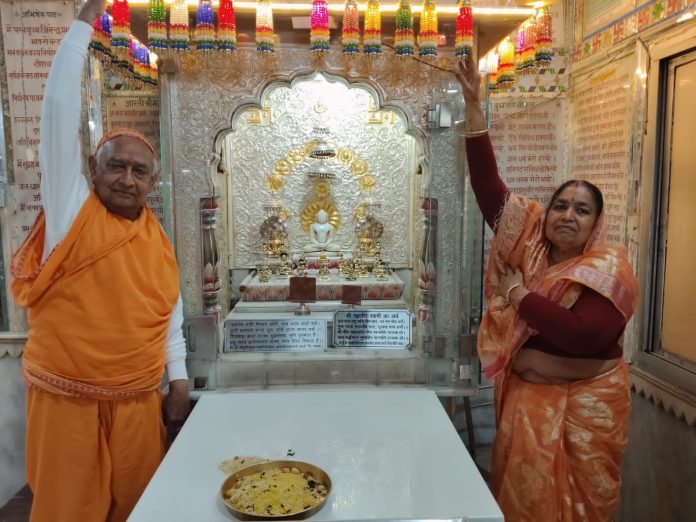 दिगम्बर जैन मंदिर चन्द्र प्रभ जी दुर्गापुरा में आज श्रावक-श्राविकाओं ने मंदिरजी की दायें व बायें तरफ की वेदियों में चंवर लगाकर अक्षय पुण्य अर्जित किया कार्यक्रम में समिति के अंतरराष्ट्रीय होम्योपैथी डॉक्टर मणी जैन ने बताया की यह कार्य गणिनी आर्यिका105 पूज्य सरस्वती माताजी की प्रेरणा व मंदिर कमेटी की सहमति से लगाये गये।इस कार्य में तीर्थंकर ग्रुप के सदस्यों ने भी खुलकर सहयोग किया मौका 1008 भगवान आदिनाथ के मोक्षकल्याणक का।इससे पूर्व माताजी ससंघ के सानिध्य में सर्वप्रथम मंदिर जी में भगवान आदिनाथ का अभिषेक व शान्तिधारा हुई, कार्यक्रम में सरस्वति माताजी ने बडी शान्तिधारा बोली व रिद्धि मंञों का उच्चारण किया।बाद में भगवान आदिनाथ के1008नामों से कलशाभिषेक व अर्घ्य समर्पित किये गये। आर्यिका सरस्वती माताजी व अनन्तमति माताजी ने पूरे 1008 अर्घ बोले व श्रावक-श्राविकाओं ने भगवान का अभिषेक व अर्घ समर्पित किये।अन्त में निर्वाणकांड भाषा का उच्चारण कर भगवान के मोक्षकल्याणक का जयकारो के साथ लड्डू चढाया गया कार्यक्रम में अभिषेक में तीर्थंकर ग्रुप अध्यक्ष डां.एम.एल जैन मणि-व डां मनीष (निदेशक फेडरेशन इन्दौर)ने भाग लिया ।चंवर चढाने में डां शान्ति जैन मणि,श्रीमती मोहिनी देवी,मैना पाटनी,निर्मला सेठी,पुष्पा मालपुरा,छाया,मनोरमा पाटनी आदि श्रावकों के अतिरिक्त ग्रुप की महिलाओं ने चंवर लगाये।डां मणि ने सब का आभार व्यक्त किया।