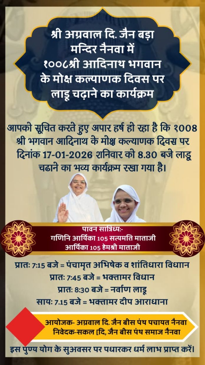 नैनवा जिला बूंदी 17 जनवरी शनिवार 2026 अग्रवाल दिगंबर जैन बड़े मंदिर में प्रातःकाल भगवा‌न का पंचामृतअभिषेक शांति धारा पूजन के साथ 1008 आदिनाथ भगवान का विधि विधान पूर्वक गणिनी आर्यिका सत्यमती माताजी हैम श्री माताजी के परम सानिध्य में अनेकों भक्तों ने निर्वाण लड्डू चढ़ाने का सौभाग्य प्राप्त किया