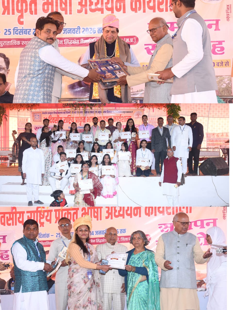 नैनागिरी (छतरपुर)। केंद्रीय संस्कृत विश्वविद्यालय, नई दिल्ली एवं प्राकृत भाषा विकास फाउंडेशन के संयुक्त तत्वावधान में आयोजित 21 दिवसीय प्राकृत भाषा अध्ययन कार्यशाला का समापन समारोह दिनांक 14 जनवरी 2024 को श्री दिगंबर जैन सिद्ध क्षेत्र नैनागिरी में गरिमामय वातावरण में संपन्न हुआ। इस कार्यशाला का उद्देश्य प्राकृत भाषा के अध्ययन, अध्यापन, शोध तथा जन-जागरूकता को सुदृढ़ करना रहा। कार्यक्रम के संरक्षक श्री सुरेश जैन (आईएएस) एवं न्यायमूर्ति श्रीमती विमला जैन रहीं। समापन समारोह के मुख्य अतिथि श्री संतोष जैन घड़ी एवं श्री संतोष जैन बैटरी रहे, जबकि अध्यक्षता प्रो. रमाकांत पांडे, निदेशक, केंद्रीय संस्कृत विश्वविद्यालय जयपुर ने की।प्रो ऋषभ जैन फौजदार दमोह द्वारा ने कहा – प्राकृत भाषा विकास फाउंडेशन ने सदा प्राकृत भाषा के लिए कार्य करने के लिए कार्य करती रहेगी।