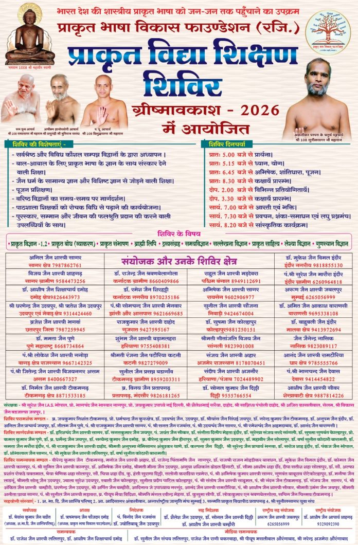 राष्ट्रीय संयोजक डॉ. आशीष जैन आचार्य, शाहगढ़ (सागर) ने बताया कि ” प्राकृत भाषा हमारी प्राचीन संस्कृति और आध्यात्मिक परंपरा की मूल धारा है। इन शिक्षण शिविरों के माध्यम से नई पीढ़ी को इस अमूल्य धरोहर से जोड़ने का प्रयास किया जा रहा है, जिससे भाषा के साथ-साथ संस्कारों का भी संवर्धन हो सके। ”