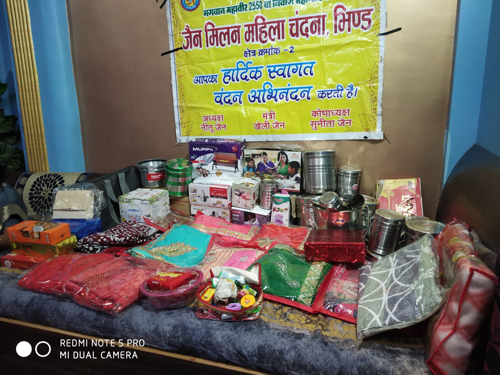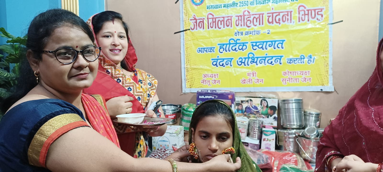 भिंड नगर मैं दिनांक 22 नवंबर 2023 बुधवार को जैन मिलन महिला चंदना द्वारा अतिगरीब बालिका के विवाह में दैनिक जीवन में उपयोगी वस्तुओं साड़ी बर्तन गैस चूल्हा कुकर कपड़े स्वेटर शाल कंबल मिठाइयां श्रृंगार किट बैग आदि आवश्यक वस्तुएं एवं नकद राशि भेंट की