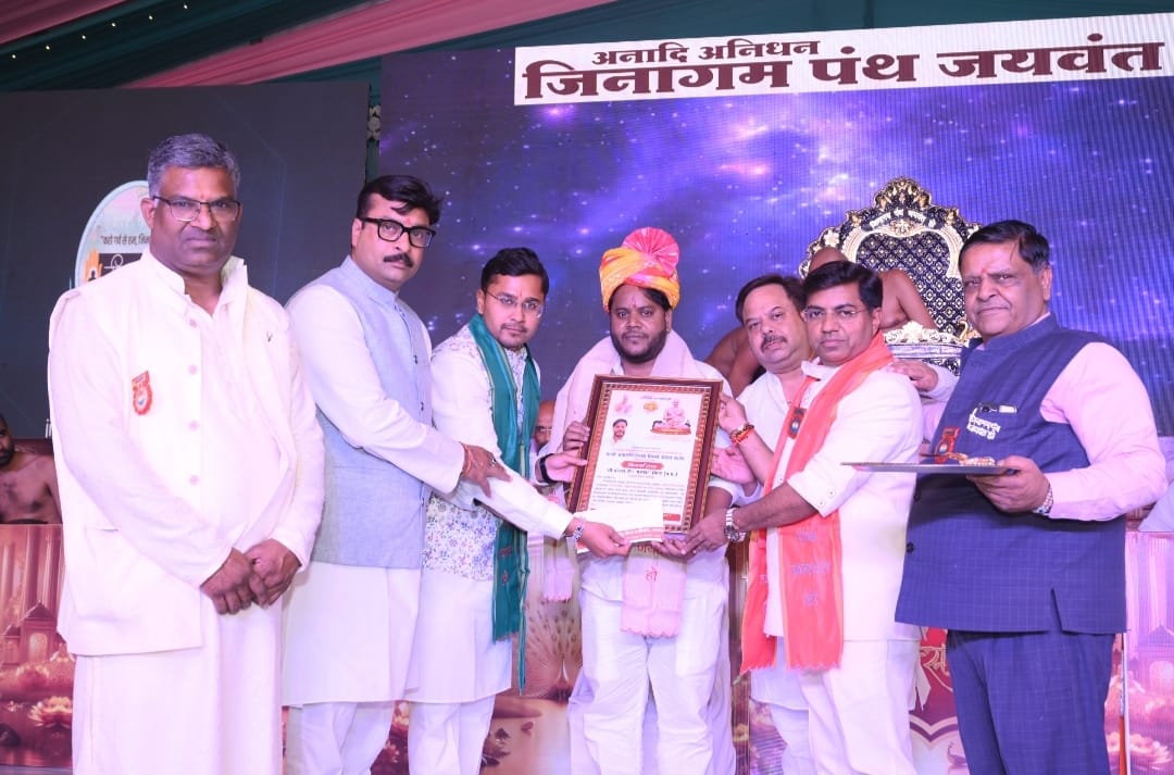आचार्य भगवन भावलिंगी संत श्री विमर्श सागर जी महामुनिराज के अवतरण दिवस के कार्यक्रम के दौरान मध्यप्रदेश के भिंड जिले के जैन समाज के “युवा पत्रकार जिनागमपंथी सोनल जैन” को आचार्य श्री विमर्श सागर जी महामुनिराज के परम् आशीर्वाद से जिनागमपंथी सोनल जैन पत्रकार को “विमर्श रत्न” पुरुस्कार देकर सम्मानित किया गया।