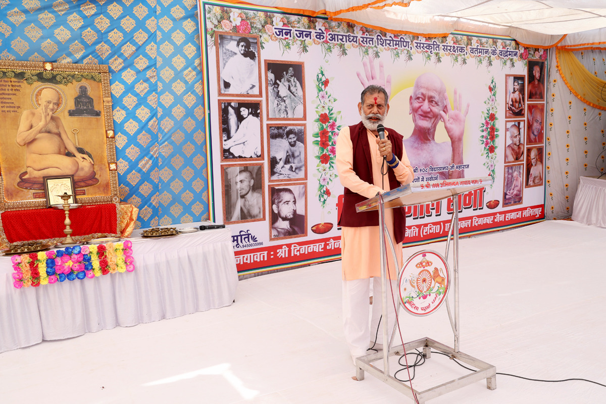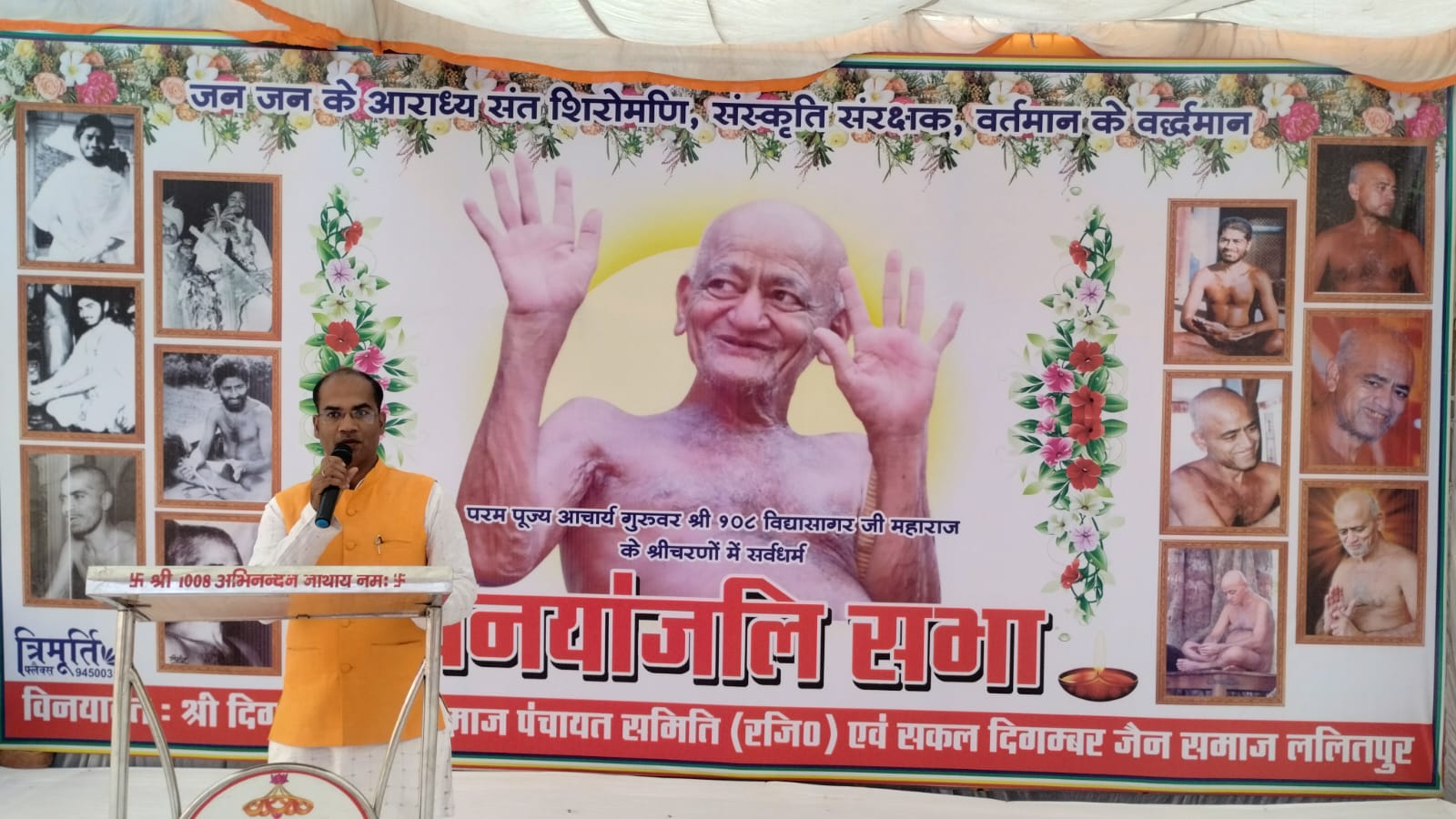 मध्यान्ह में विनयांजलि सभा का शुभारम्भ महंत कृष्णगिरि महाराज, ईसाई धर्म के पादरी किशोर मेथुम, सिख धर्म के ज्ञानी युवराजसिंह ने आचार्य श्री के चित्र के सम्मुख दीपप्रज्जवलित कर किया। मंगलाचरण आचार्य श्री विद्यासागर पाठशाला परिवार की बहिनों ने गुरूमक्ति पूर्वक किया। आचार्य लश्री के जीवन पर आधारित डाकूमेंन्टरी के माध्यम से उनके विराट जीवन का चित्रण मंच पर किया गया। उत्तरप्रदेश सरकार के राज्यमंत्री मनोहरलाल पंथ ने आचार्यश्री को जन-जन का संत बताते हुए उनके वियोग को राष्ट्र की अपूरणीय क्षति बताया। भारत सरकार के पूर्व केन्द्रीयमंत्री प्रदीप जैन आदित्य ने कहा आचार्यश्री के जहां -जहां चरण पड़े वहां से संस्कारों की वह धारा निकली जिससे व्यक्ति के जीवन में वह परिवर्तन आया जिसकी कल्पना नहीं की जा सकती। महंत कृष्ण गिरि महाराज ने आचार्य लश्री की साधना और त्याग को आदर्श बताते हुए कहा वह संत समाज के लिए आदर्श हैं। प्रतिभास्थली की दीदी ने डोगरगढ में आचार्य लश्री की उत्कृष्ट साधना समाधी का दृश्य जब उपस्थित जनसमुदाय के सम्मुख रखा तो आंख नम हो गई । उन्होंने कहा आचार्यश्री कहीं नहीं गए हम सब के बीच हैं, सदैव आशीर्वाद उनका हमारे साथ है उनके आशीवाद से चल रहे प्रकल्पों को संबल प्रदान करने का दायित्व हम सबका है। स्मरण रहे आचार्य श्री विद्यासागर महामुनिराज की समतापूर्वक संलेखना समाधि 18 फरवरी 24 को चन्द्रगिर डोगरगढ़ में हुई जिनकी खबर से पूरी समाज स्तब्ध है। आचार्यश्री की पहिचान अपराजेय साधक के रूप में रही जिन्हें 22 वर्ष की आयु में जैनेश्वरी दीक्षा ग्रहण कर आचार्य श्री ज्ञानसागर महाराज ने 22 नवम्बर 1972 को आचार्य पद प्रदान किया। आचार्यश्री की प्रेरणा से हजारों मूक पशुओं का संरक्षण गौशाला के माध्यम से हो रहा है वहीं हजारों बालिकाएं प्रतिभास्थली में संस्कारित हो रही हैं। आचार्यश्री ने राष्ट्र हित में भारतीय शिक्षा पद्यति लागू करने, छात्र-छात्राओं की पृथक शिक्षा, चिकित्सा व्यवसाय नहीं सेवा के रूप में अपनाने के लिए समाज को प्रेरित किया। मांस निर्यात को कलंक बताते हुए भारतीय प्रतिभाओं का निर्यात रोकने के लिए समाज काआव्हान किया।