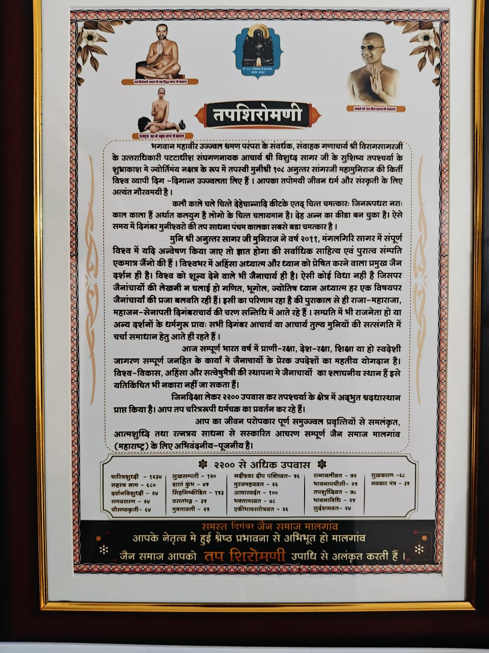 आचार्य श्री विशुद्धसागर महाराज जी के शिष्य श्रमण मुनी श्री अनुत्तर सागर महाराज जी को दिगंबर जैन समाज मालेगांव द्वारा 21 नवम्बर को ” गुरुवार को तपशिरोमणी ” उपाधी से अलंकृत किया गया |