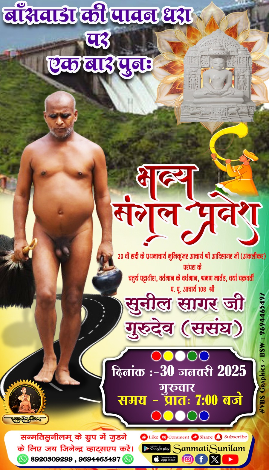 बांसवाड़ा की पावन धरा पर महान तपस्वी आदि सागर महाराज के परंपरा के चतुर्थ पटाधीश सुनील सागर महाराज का प्रातः 7:00 बजे शहर में मंगल प्रवेश गाजे बाजे अपार जैन बंधु अपार महिलाओं रंगोली सजाकर मंगल गीत गाते हुए आसपास के शहरों से आये मुनि भक्तों ने मंगल प्रवेश पर पहुंचकर आचार्य श्री का भव्य आशीष प्राप्त किया