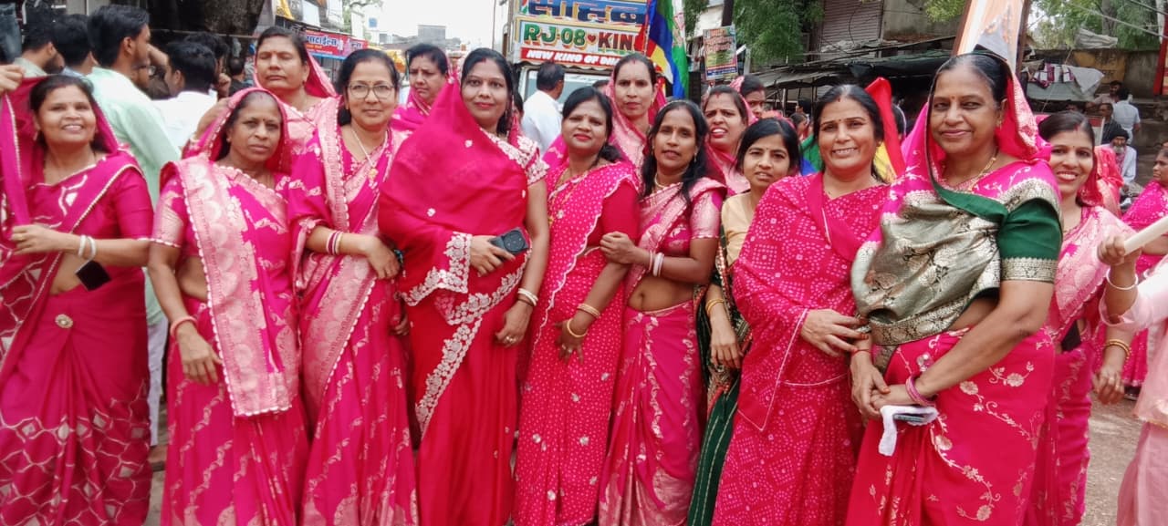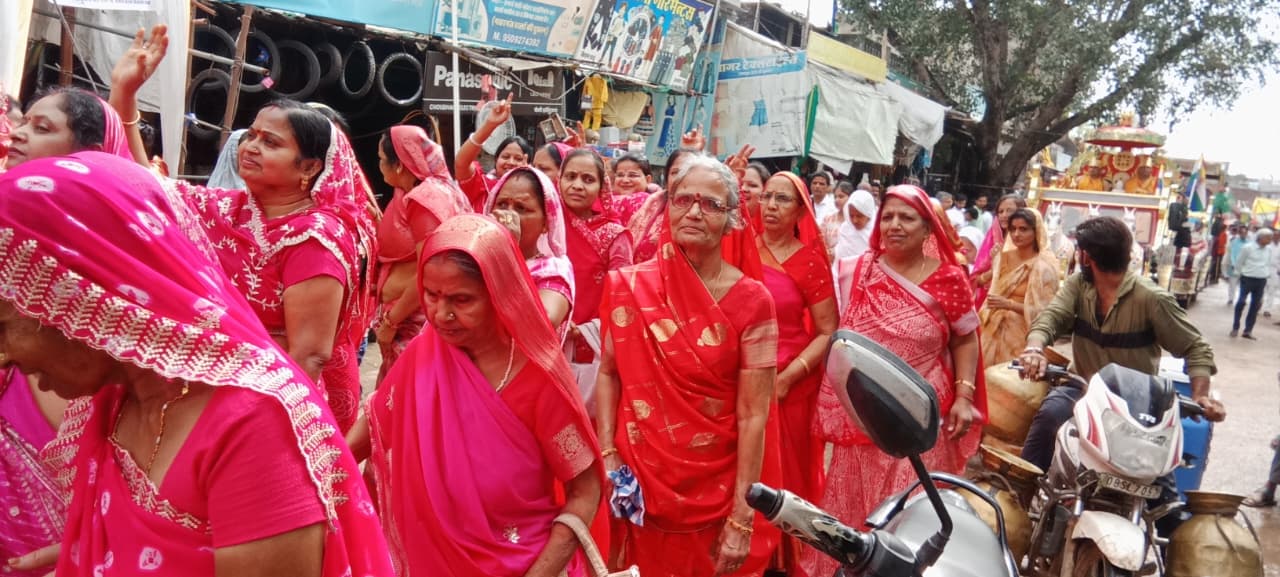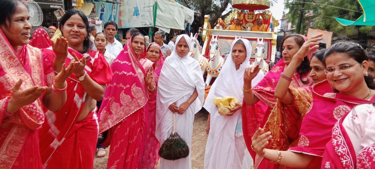 गणिनी आर्यिका 105 विशेष मती माता जी के परम सानिध्य में गाजा बाजा से भगवान की शोभा यात्रा निकाली शोभा यात्रा में जगह-जगह पर भव्य स्वागत द्वारा बनाए गए