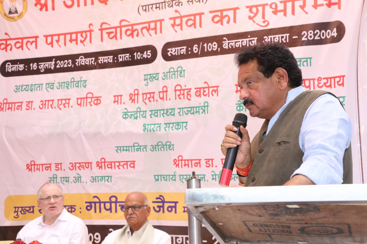 आगरा शहर के आदिवीर वात्सल्य संस्थान बेलनगंज की ओर से बेलनगंज के 6 /109 में 16.7.2023 रविवार को आगरा नगर के केंद्र बिंदु जहां चरित्र चक्रवर्ती आचार्य शांति सागर जी जब दक्षिण भारत से उत्तर की ओर आए थे उस क्षेत्र में एक पारमार्थिक परामर्श चिकित्सालय का भव्य शुभारंभ देश की आजादी के 75 वें अमृत महोत्सव, एवं तीर्थंकर भगवान महावीर स्वामी के 2550 वें निर्वाण वर्ष के पावन अवसर पर हुआ, जैन धर्म की भारत के अंदर पताका लहराने वाले शिरोमणि ,महान आचार्य का अपने संघ सहित देश की आजादी से पूर्व बेलन गंज आगरा मैं मंगल आगमन हुआ था, तत पश्चात आचार्य महावीर कीर्ति जी, देश भूषण जी, विमल सागर जी , विद्या नंद जी,कुंथुसागर जी , तपस्वी सम्राट श्री सन्मति सागर जी महाराज , संभव सागर जी, विद्यासागर जी, विजयमति माता जी का दीक्षा का पूर्व संस्कार यहां हुआ। इस प्रकार क्षेत्र की भूमि ऐतिहासिक रूप से धन्य हुई । प्रसिद्ध समाजसेवी गोपीचंद बडजात्या ने अवगत कराया कि हमारी भावना को साकार रुप मिला और परम गुरु जनों के महान आशीर्वाद के द्वारा मुझे मेरे प्रयास मैं सफलता मिली जो मैं कई वर्षों से प्रयासरत था, मैं परम पूज्य प्रातः वंदनीय जगद्गुरु गणधराचार्य श्री कुंथुसागर जी, तपस्वी सम्राट श्री सन्मति सागर जी महाराज,छह रस त्यागी आचार्य श्री संभव सागर जी , आचार्य श्री कनक नंदी जी , आचार्य श्री विशुद्ध सागर जी, मां नंग मती माताजी सहित अनेक परम पूज्य आचार्यों के आशीर्वाद के द्वारा मुझे सफलता मिली। इस आयोजन का शुभारंभ केंद्रीय स्वास्थ्य राज्यमंत्री श्री एस .पी .सिंह बघेल , एवं देश के सुपर प्रसिद्ध होम्योपैथिक चिकित्सक श्री आर .एस. पारीक द्वारा किया गया, कार्यक्रम में मंत्री जी का स्वागत निर्मल मुठिया, जितेंद्र जैन , कमल जैन एडवोकेट,अशोक बेनारा, संदीप पटनी, सुशील जैन ca, मातृशक्ति अंशिका कासलीवाल, टोची जैन , आकांक्षा जैन बड़जात्या, द्वारा राजस्थानी पगड़ी, दुपट्टा, एवं माला पहनाकर सभी आगंतुक मेहमानों का स्वागत किया गया कार्यक्रम में मंगला चरण सुरभि पाटनी, शशि पाटनी , शोभना लुहाड़िया द्वारा किया गया। इस अवसर पर सभा में राजेंद्र एडवोकेट, शैलेंद्र एडवोकेट, विभू बेनरा, शशिकांत जैन, सुनील जैन ठेकेदार, नरेंद्र गोधा, पूर्व पार्षद दीपक खरे, प्रियांशु बड़जात्या ,सचिन जैन इटावा वाले, गाजियाबाद से गुरु भक्त पवन जैन , अनिल जैन भैया जी टूंडला से, जयपुर से संजय कुमार जैन, अंकित कासलीवाल, अंशु जैन फतेहपुर सीकरी से लक्ष्मी नारायण शर्मा उपस्थित थे, इस अवसर पर मंत्री जी ने संस्था के मुख्य संयोजक गोपी चंद जैन के द्वारा किए गए व्यक्तिगत प्रयासों की सराहना करते हुए शुभकामनाएं दी,डॉ साहब ने कहा यहां पर एमडी एमएस द्वारा सेवा प्रदान की जाएगी गोपी चंद जैन के प्रयास उत