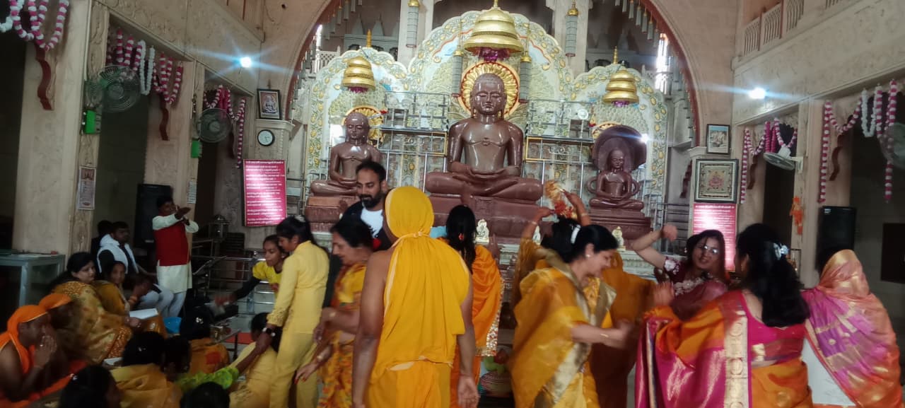 नैनवा जिला बूंदी के संवाददाता जैन गजट पेपर के महावीर सरावगी की शादी के 45 वर्ष गांठ पर पहली बार अपार यंत्रों से संगीत मय नृत्य की प्रस्तुतियों के साथ शांतिनाथ भगवान की शांति धारा पूजन विधान संपन्न हुआ