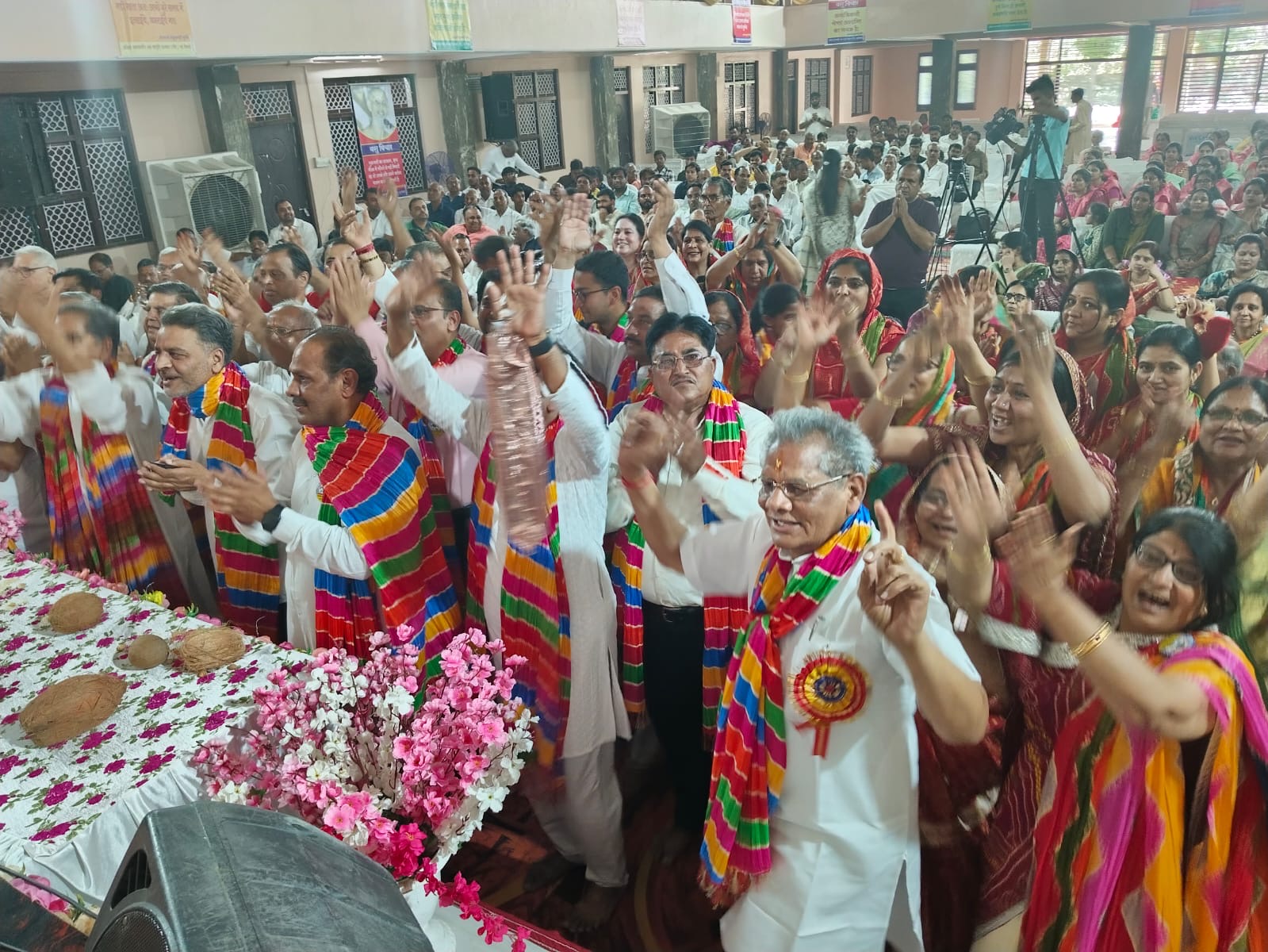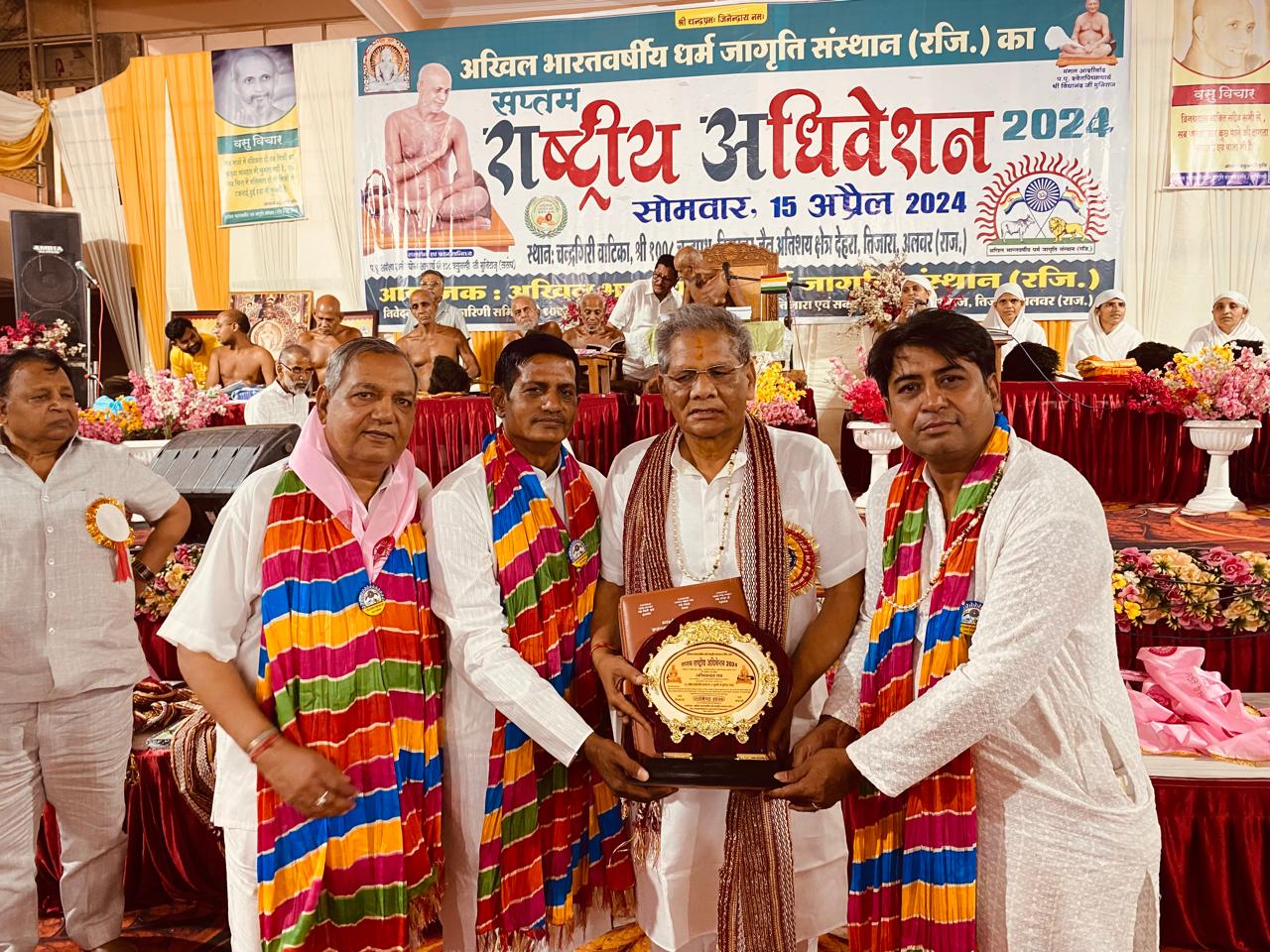 जयपुर – अखिल भारतवर्षीय धर्म जागृति संस्थान का सातवां राष्ट्रीय अधिवेशन देहरा तिजारा के प्रांगण में परम पूज्य आचार्य श्री वसुनंदी महामुनिराज ससंघ के पावन सानिध्य में 15 अप्रैल 2024 को पूरे देश से पधारे क़रीब सात सो प्रतिनिधियों की उपस्थिति में राजस्थान प्रान्त की शाखा को सर्वश्रेष्ठ शाखा घोषित किया गया कार्यक्रम में आचार्य श्री ने कहा कि काम करने वाले का सम्मान करना प्रोत्साहन व प्रेरणा का कार्य करता है,आचार्य श्री ने उत्कृष्ट कार्य करने हेतु चयनित शाखाओ के नाम की घोषणा की जिसमे राजस्थान की प्रांतीय शाखा को संस्थान की राष्ट्रीय सर्वश्रेष्ठ शाखा चुना गया , संस्थान के प्रवक्ता राजाबाबू गोधा ने अवगत कराया कि प्रांतीय अध्यक्ष पदम जैन बिलाला जयपुर के नेतृत्व में समाज हित में महत्वपूर्ण कार्य संपन्न करने पर वसुनंदी महाराज के जयकारों व करतल ध्वनि के बीच पदम बिलाला का राष्ट्रीय कार्यकारिणी व तिजारा कमेटी द्वारा एतिहासिक सम्मान किया गया जिसके बाद उन्होंने सभी पदाधिकारीयों के साथ पूरे संघ से आशीर्वाद प्राप्त किया आचार्य श्री द्वारा महिला वर्ग शाखा में प्रथम -उत्तम नगर दिल्ली,द्वितीय -ग्रीन पार्क दिल्ली तथा तृतीय – जनुथर जिला डीग व पुरुष वर्ग में प्रथम -अलवर द्वितीय -मेरठ ,तथा तृतीय – सलूम्बर को चयनीत किया गया,पदम बिलाला ने अवगत कराया कि उक्त अधिवेशन में सभी कार्यकर्ताओं व पदाधिकारियो को सम्मानित किया गया जिसमे किरण जैन ,महेश काला जयपुर ,राजीव लाखना जयपुर ,देवेंद्र जैन कठूमर, पवन जैन अलवर,घनश्याम जैन जनुथर, राजेंद्र जैन झंडा जयपुर,संजय सर्राफ कामां ,सुंदरम जैन सलूंबर,प्रेमचंद जैन तिजारा आदि प्रमुख रहे ,संस्थान के महामंत्री सुनील पहाड़िया ने अवगत कराया कि उक्त
