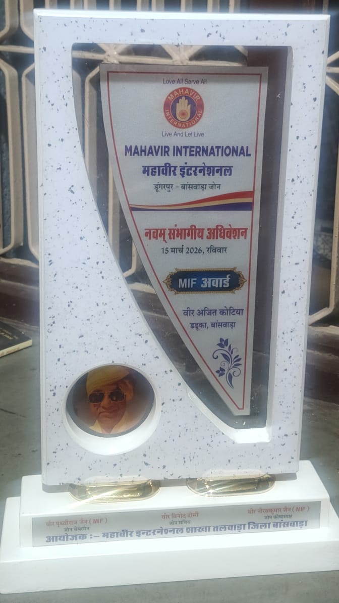 महावीर इंटरनेशनल के गवर्निंग काउंसिल सदस्य, इंटरनेशनल डायरेक्टर नॉलेज शेयरिंग एवं ई चौपाल तथा एम आई एफ वीर अजीत कोठिया को वागड़ जोन डूंगरपुर बांसवाड़ा द्वारा नवम संभागीय अधिवेशन तलवाड़ा में प्रतिष्ठित एम आई एफ अवॉर्ड 2026 प्रदान कर बहुमानित किया गया है। अंतरराष्ट्रीय अध्यक्ष अनिल जैन, अंतर्राष्ट्रीय उपाध्यक्ष गौतम राठौड़, जोन चेयरमैन पृथ्वीराज जैन तथा समारोह गौरव राकेश मीणा ने कोठिया का माल्यार्पण, पगड़ पहनाकर, शाल ओढ़ाकर तथा चमचमाती एम आई एफ अवॉर्ड 2026की ट्रॉफी भेट कर सम्मानित किया। कोठिया की इस गौरवशाली उपलब्धि पर रामभरत चेजारा, मणिलाल सूत्रधार, सुंदरलाल पटेल, विष्णप्रसाद रावल, जगदीश वागड़िया, ललित पाटीदार, रणजीत सिंह सोलंकी, जगदीश जोशी, राहुल कलाल तथा कुलदीप वसीटा ने हार्दिक शुभकामनाएं दी है।