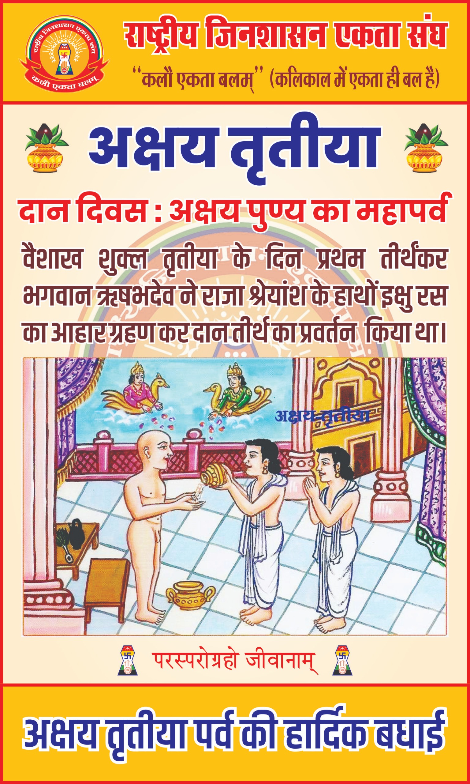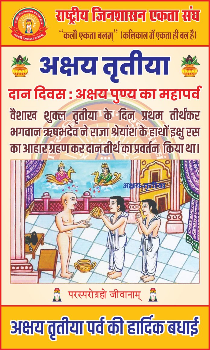 राष्ट्रीय जिनशासन एकता संघ द्वारा अक्षय तृतीया दान दिवस के पावन पर्व पर इंदौर शहर के विभिन्न मंदिरों में ‘दान तीर्थ दिवस’ के रूप में विशेष प्रभावना का वितरण किया गया । प्रथम तीर्थंकर भगवान आदिनाथ के प्रथम आहार दिवस की स्मृतियों को याद करते हुए संघ द्वारा इन जिनालयों में इक्षु रस का वितरण किया गया। राष्ट्रीय जिन शासन के प्रचारक राजेश जैन दद्दू एवं अध्यक्ष मयंक जैन ने बताया कि नगर के इन प्रमुख मंदिरों में हुआ वितरण: