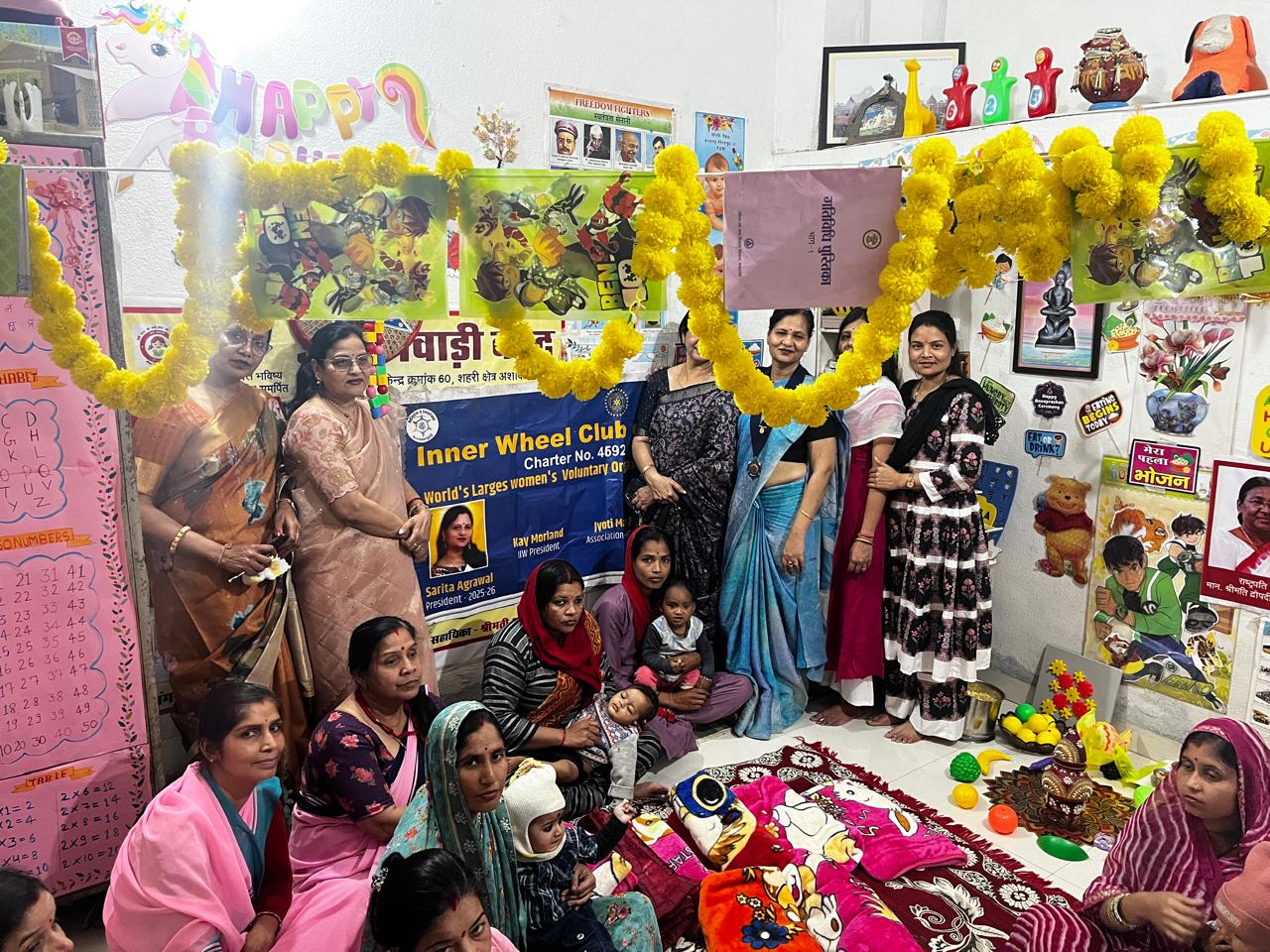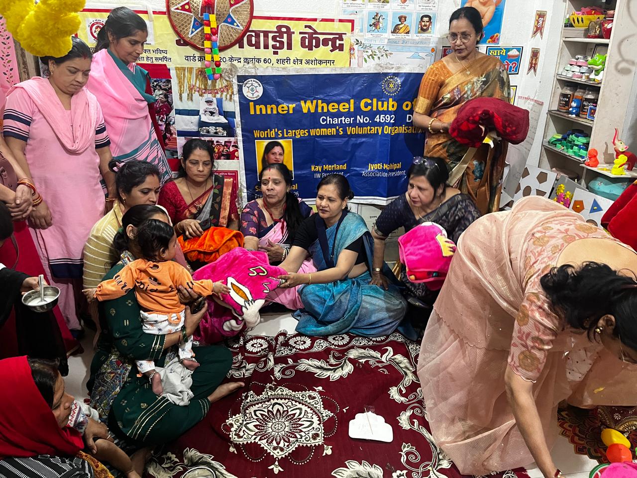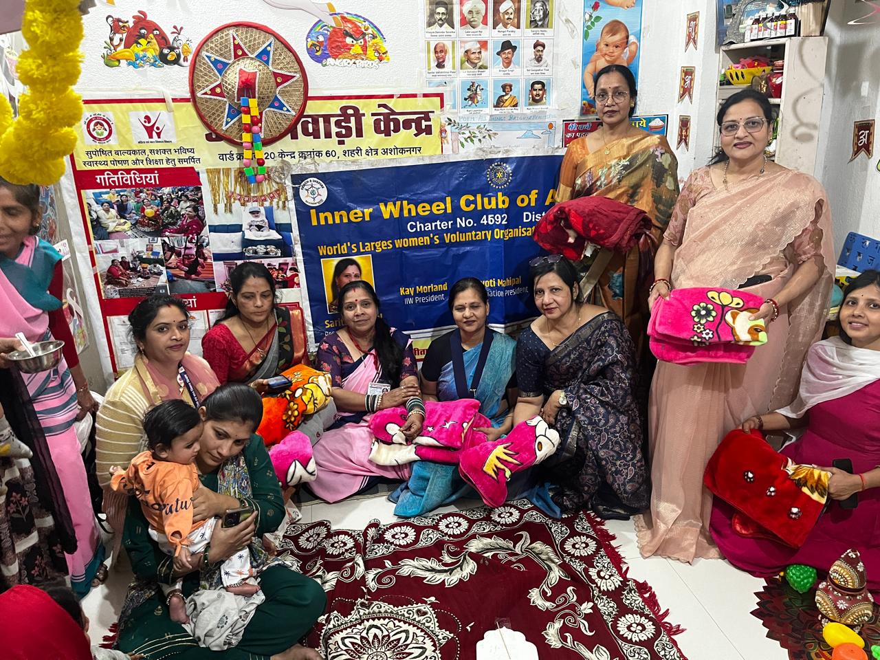 प्रथम चित्र: आंगनवाड़ी केंद्र में इनर व्हील क्लब की सदस्याएं एक नन्हे बालक को प्रेमपूर्वक कंबल भेंट कर प्रोत्साहित करती हुईं।