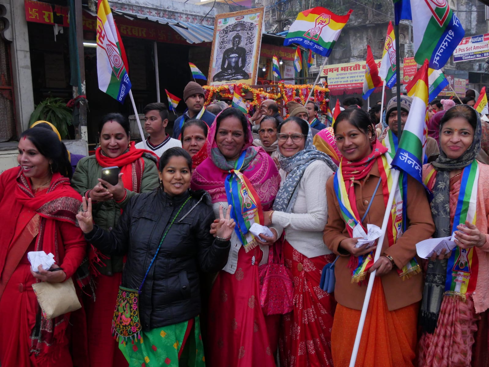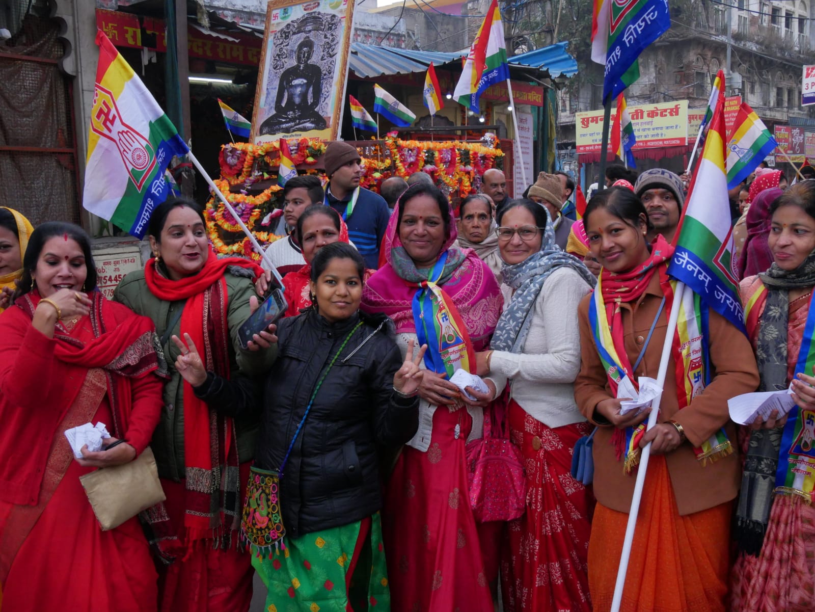 बडी संख्या में महिलाएं जैन ध्वज हाथ में लेकर चल रही थी छोटे छोटे बच्चों ने भी जैन पताका हाथ में लेकर पदयात्रा में भाग लिया।
