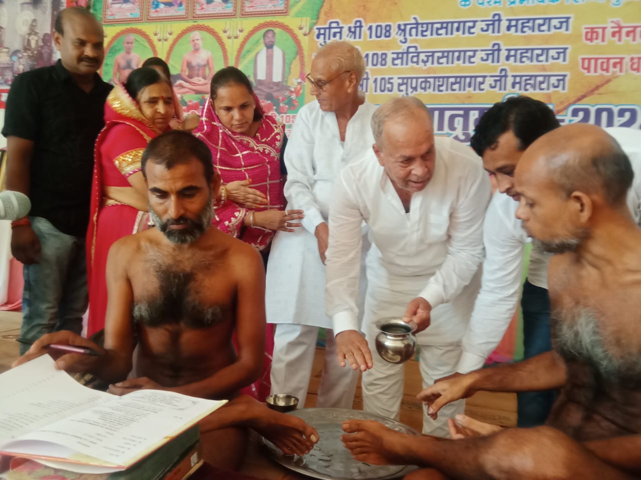 आज भक्तामर के पुनार्जक पारस कुमार जैन नितेश शैलेंद्र रोहित जैन बरमूडा परिवार द्वारा दीप प्रज्वलित चित्र अनावरण मुनि के पाद पक्षालन
