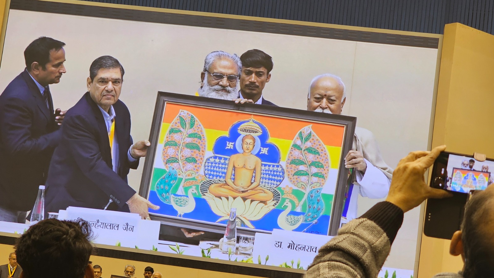 भगवान महावीर के 2550वें निर्वाण कल्याण महोत्सव का आयोजन राष्ट्रीय स्वंयसेवक संघ के तत्वावधान में विज्ञान भवन, नई दिल्ली में आयोजित किया गया। समारोह का शुभारंभ दीपप्रजजवलन तथा मंगलाचरण द्वारा हुआ। श्री भारतवर्षीय दिगम्बर जैन महासभा के राष्ट्रीय अध्यक्ष श्री गजराज जैन गंगवाल, भगवान महावीर मेमामेरियल के अध्यक्ष श्री कैन्हयालाल जैन, श्री संवेग लाल भाई, श्री सुखराज सेठिया, श्री सत्यभूषण जैन तथा अन्य गणमान्य अतिथियों ने दीप प्रज्जवजन कर समारोह का शुभांरभ किया। महासभा के राष्ट्रीय अध्यक्ष श्री गजराज जैन गंगवाल ने कहा कि भगवान महावीर ने कहा कि भगवान महावीर के उपदेशों पर अमल कर ही विश्व को शांति के मार्ग पर अग्रसरित किया जा सकता है। हम सभी को भगवान महावीर के उपदेश सत्य, अहिंसा और अपरिग्रह को अपने जीवन में अपनाना चाहिये। राष्ट्रीय स्वयंसेवक संघ के तत्वावधान में विज्ञान भवन में आयोजित भगवान महावीर के 2550वें निर्वाण महोत्सव के अवसर पर सरसंघचालक मोहन भागवत ने कहा कि प्राचीन काल से वैदिक और श्रमण परंपरा साथ-साथ चलती आई है। दोनों ने एक-दूसरे से बहुत कुछ लिया और दिया है। भगवान महावीर सबके हैं, उनके अहिंसा, संयम, अनेकांत और स्याद्वाद सिद्धांत हमेशा आगे बढ़ाना सिखाते हैं। उनका दर्शन आज भी प्रासंगिक है। हमे संकल्प लेना होगा कि उनके सिद्धांतों को आचरण में उतारेंगे। संघ की सभी शाखाओं मे जैन आगमों की वंदना भी की जाती है। संघ की सभी 70 हजार शाखाएं भगवान महावीर का निर्वाण महोत्सव मना रही हैं। विविधता में एकता ही भारत की शक्ति है। उन्होंने सभी आचार्यों को वंदन करते हुए कहा कि हम सबको एक रहकर ही देश को आगे बढ़ाना है। भागवत ने दो पुस्तकों का लोकार्पण भी किया। समारोह को सान्निध्य प्रदान करते हुए आचार्य श्री प्रज्ञसागरजी ने कहा कि आज महाविनाश विश्व की सबसे बड़ी समस्या है तो महावीर उन सबका समाधान हैं। जैन धर्म अत्यंत वैज्ञानिक है, जो स्वतंत्रतावादी और अनेकांतवादी है। इस महोत्सव में सबके कल्याण की भावना छिपी है। आचार्य श्री सुनील सागरजी ने कहा कि महावीर का तीर्थ सर्वोदय तीर्थ है, जिसमें सबका कल्याण निहित है। संघ पूरे देश को जोड़कर अच्छा कार्य कर रहा है। प्रवर्तक डॉ. राजेंद्र मुनि जी ने कहा कि संगठन जरूरी है और इसी में शक्ति है। विदुषी साध्वी अणिमाजी ने कहा कि वृद्धाश्रम हमारी संस्कृति नहीं हैं, माता-पिता की सेवा जरूरी है। साध्वी प्रीति रत्नाश्री ने कहा कि जिसका मन हिंसा विज्ञान भवन में आयोजित हुआ भगवान महावीर का 2550वां निर्वाण महोत्सव से दुखी हो वही हिंदू है। समारोह में जैन समाज की सभी आम्नायों के वरिष्ठ व्यक्ति सत्यभूषण जैन, गजराज जैन गंगवाल, कन्हैया लाल, सुखराज सेठिया सहित चक्रेश जैन, रवी