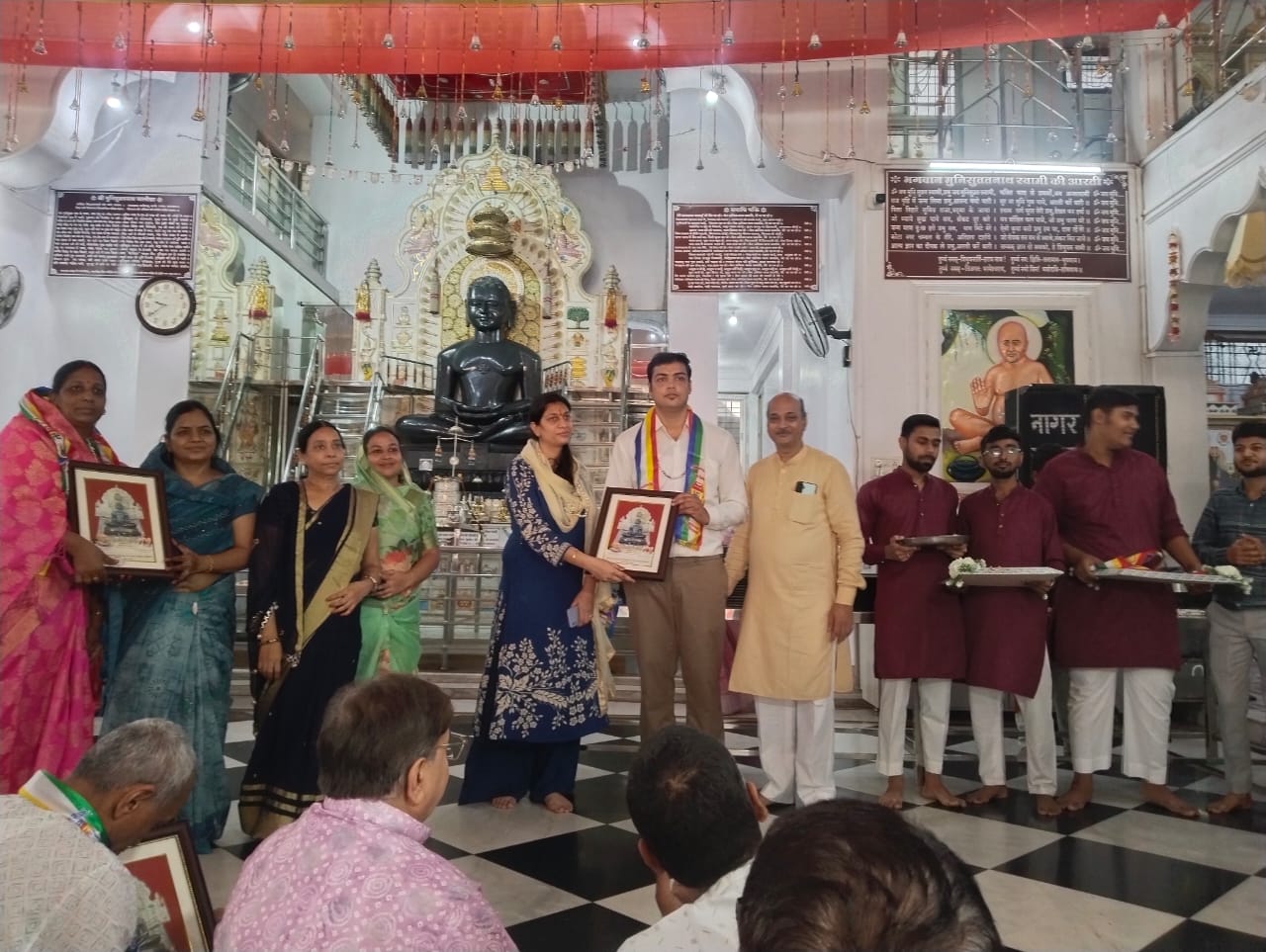 कोटा आर के पुरम स्थित परम पूज्य जंगल वाले बाबा मुनि श्री चिन्मय सागर जी महाराज की मंगल प्रेरणा से निर्मित शनि अरिष्ट निवारक मुनिसुव्रतनाथ दिंगबर जैन त्रिकाल चौबीसी जैन मंदिर में हर्षौल्लास के वातावरण में विगत दस दिनों तक दस लक्षण पर्व के पावन सुअवसर पर विभिन्न धार्मिक आयोजनों के साथ मनाया गया।जैन धर्म दर्शन के विद्वान पंडित अभिषेक शास्त्री दमोह ने दस लक्षण विधान में अपनी अनोखी परिचित शैली में संगीत की सुमधुर धुनों के साथ चार चांद लगा दिए। श्रद्धालुओं खूब भक्ति भाव ओर श्रद्धा के साथ नृत्य किया। मंदिर समिति के अध्यक्ष अंकित जैन बताया कि दिनांक 8 सितंबर को प्रातः नित्य अभिषेक शांति धारा पूजन के बाद दस लक्षण पर्व समापन पर एक अभिनंदन समारोह आयोजित किया गया।इसमें सबसे अच्छी बात यह रही कि जो मंदिर के माली ओर पुजारी है उनका सबसे पहले अभिनंदन किया गया। ये लोग सुबह 4 बजे से ही मंदिर की व्यवस्थाओ में लग जाते थे। उसके बाद सबसे बड़ी यह रही कि जो मंदिर की नींव से जुड़े थे उन श्रद्धालुओं बुलाकर उनकी सेवाओं को देखते हुवे उनका भाव भीना अभिनंदन किया गया। मंदिर समिति के महामंत्री अनुज गोधा ओर कार्याध्यक्ष प्रकाश जैन ने बताया कि इस अवसर पर जैन समाज आर के पुरम की युवा प्रतिभाओं है उनका भी सम्मान किया गया। मंदिर समिति के प्रचार प्रसार मंत्री पारस जैन “पार्श्वमणि” और उपाध्यक्ष लोकेश जैन बरामुंडा ने बताया कि दस लक्षण के 10 उपवास 5 उपवास 3 उपवास की साधना करने वाले श्रद्धालुओं का भी भावभरा अभिनंदन किया गया। मंदिर समिति के कोषाध्यक्ष ज्ञानचंद जैन एवं संयोजक पंकज जैन ने बताया कि इस अवसर पर अमोलक चन्द जैन रूप चंद जैन विनोद जैन टोरडी जय कुमार जैन डॉक्टर निलेश जैन पदम जैन पवन जैन संजय जैन राजेश जैन भागचंद मित्तल मुकेश पपड़ीवाल पी सी जैन सुनील ठोरा महावीर जैन चंदेश जैन इत्यादि श्रेष्ठिजन उपस्थित थे।