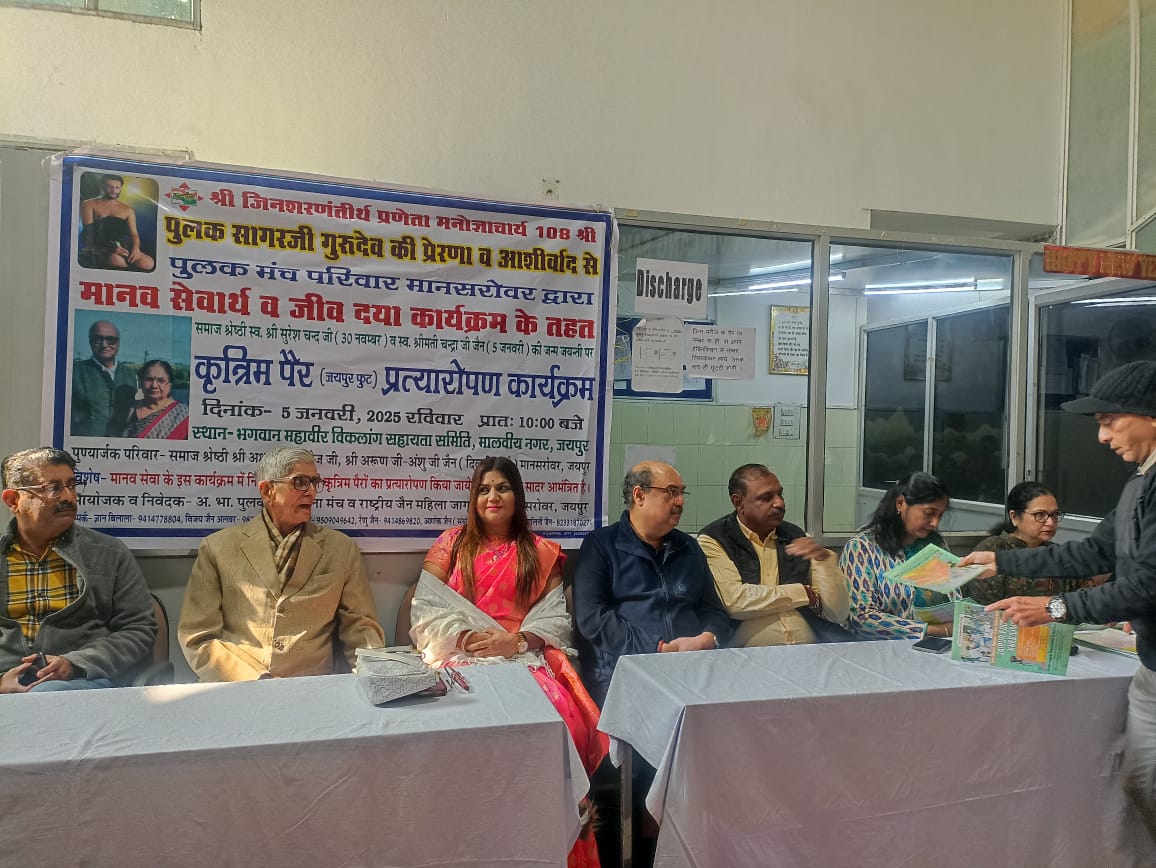 जयपुर में जैनाचार्य 108 श्री पुलक सागर जी गुरुदेव के मंगल मेंआशीर्वाद से दिनांक 05 जनवरी 2025, रविवार को प्रातः 10 बजे मानव सेवा व जीव दया धर्म कार्यक्रम के तहत निःशुल्क जयपुर फुट वितरण का कार्यक्रम आयोजित किया गया, कार्यक्रम में समाज सेवी दीपक पहाड़िया ने बताया की पुलक मंच के पुरुष विंग के अध्यक्ष श्री ज्ञान बिलाला व महिला विंग की अध्यक्ष श्रीमती सुमन जैन ने कार्यक्रम के बारे में विस्तृत जानकारी देते हुए बताया कि कार्यक्रम की अध्यक्षता भगवान महावीर विकलांग सहायता समिति के निदेशक व पूर्व डिप्टी गवर्नर भारतीय रिजर्व बैंक डॉक्टर डी आर मेहता सा ने की,कार्यक्रम के प्रमुख सहयोगी श्री अक्षय जी, अरुण जी जैन दिल्ली वालों का परिवार मानसरोवर, जयपुर निवासी रहे जिन्होंने अपने पूज्य पिताजी स्व. श्री सुरेश जी व पूज्य माताजी स्व. श्रीमती चंदा देवी जी के जन्मदिवस के अवसर पर 21 असहाय निःशक्त जनो को जयपुर फुट प्रदान किये जाने हेतु सहयोग किया। संस्था के निदेशक श्री मेहता ने जयपुर फुट लगाए जाने की पूरी प्रक्रिया समझाई व बताया कि जयपुर फुट से करोड़ो लोगो के जीवन मे नई ऊर्जा का संचार हुआ है आज वो अपना रोजगार और परिवार का पालन पोषण कर रहे है। आज जयपुर फुट ने देश की अंतरराष्ट्रीय स्तर पर पहचान बनाई है। समस्त पुलक मंच परिवार, मानसरोवर जयपुर के सदस्य गणों ने इस कार्यक्रम में अपनी सहभागिता निभाते हुए सक्रिय भूमिका निभाई। इस अवसर पर पुलक मंच की राष्ट्रीय संगठन मंत्री श्रीमती पूनम विनायका व राष्ट्रीय शिक्षा मंत्री श्री अशोक जैन विशेष आमंत्रित अतिथि के रूप में उपस्थिति रहे।