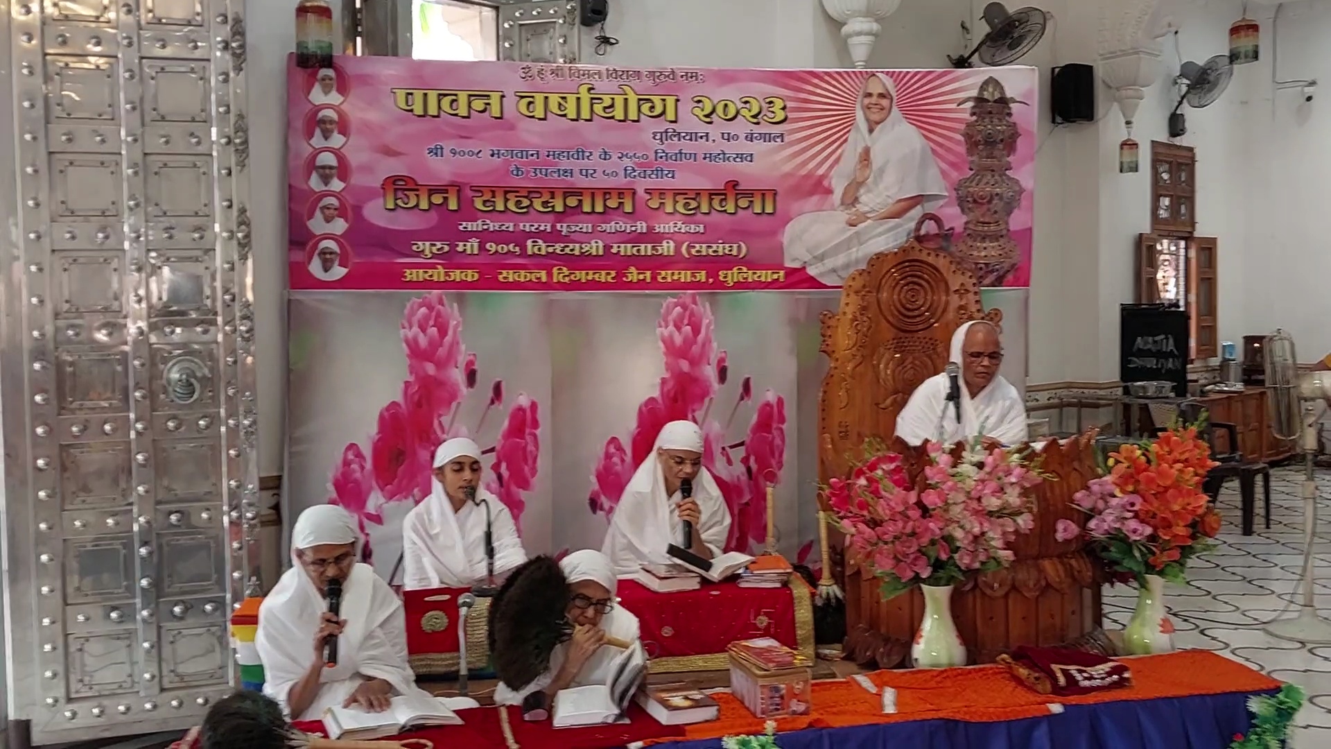 धुलियान पश्चिम बंगाल:- इस वर्ष श्री 1008 भगवान महावीर का 2550वां निर्वाण महा महोत्सव के उपलक्ष में पवित्र गंगा नदी किनारे वसा श्री 1008 भगवान महावीर दिगंबर जैन मंदिर पर आर्यिका विन्ध्यश्री माताजी ससंघ के सानिध्य में ता:- 09 जुलाई 2023 से 50 दिन का जिन सहस्र नाम महार्चना भक्ति भाव के साथ हो रहा है जो 27 अगस्त 2023 तक चलेगा, हर दिन का एक पुण्यार्जक होता है, जिसमें सहस्र नाम का जाप, स्वयंम्भु स्तोत्र आदी का पाठ होता है जो आनन्द के साथ भक्त झूमते हुए नजर आते है, सांय को भक्तामर रिद्धिमन्त्र से दीप प्रज्वलन, प्रवचन, आनन्द यात्रा, आरती रोजाना होता है | सब मिलाकर धुलियान में धर्म की गंगा वह रही है, ग्यात हो आर्यिका विन्ध्यश्री माताजी ससंघ का वर्षायोग धुलियान पश्चिम बंगाल में धर्म प्रभावना के साथ चल रहा है इस कारण श्रावक में उत्साह का माहोल है…संजय कुमार जैन बड़जात्या धुलियान मुर्शिदाबाद पश्चिम बंगाल