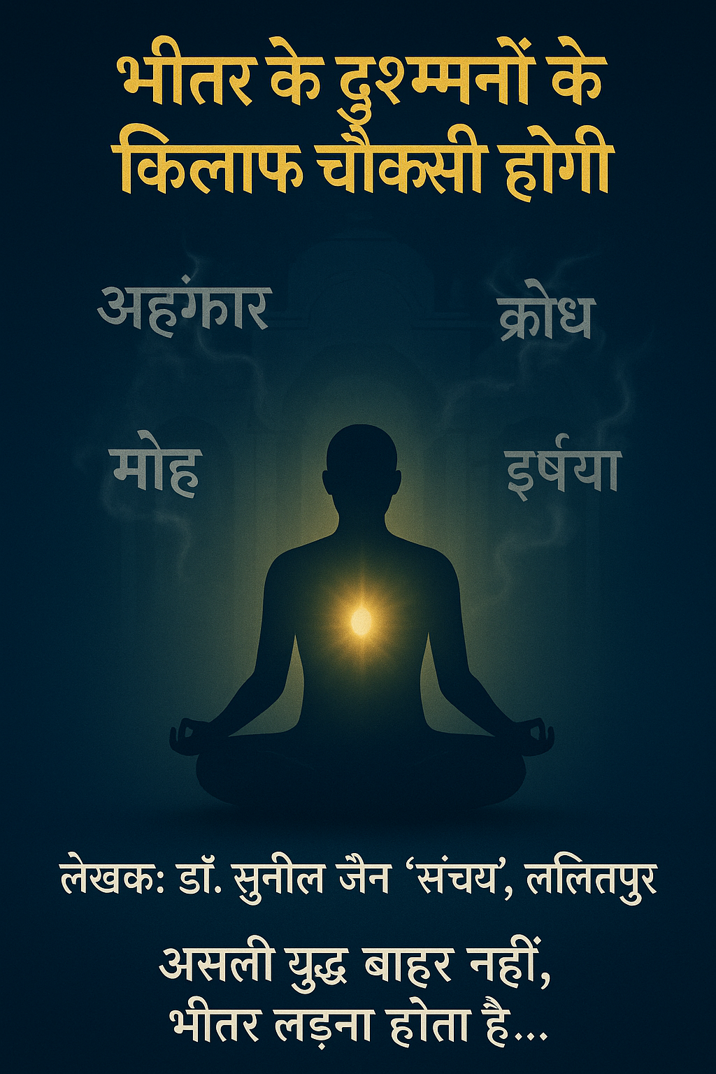 उपसंहार : आज का मनुष्य बाहरी तकनीक में कुशल हो गया है, पर आत्मिक सजगता में कमजोर होता जा रहा है। भीतर के दुश्मनों के विरुद्ध युद्ध ही सच्चा आत्मयुद्ध है। जैन धर्म इसे “अंतरयात्रा” कहता है – जहाँ युद्ध बाहरी नहीं, आत्मा के कल्याण हेतु होता है।