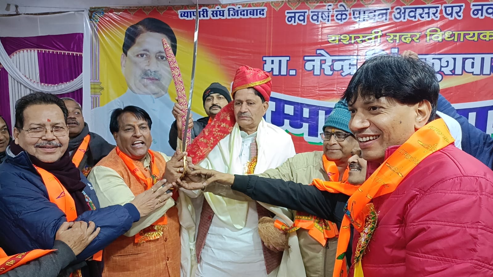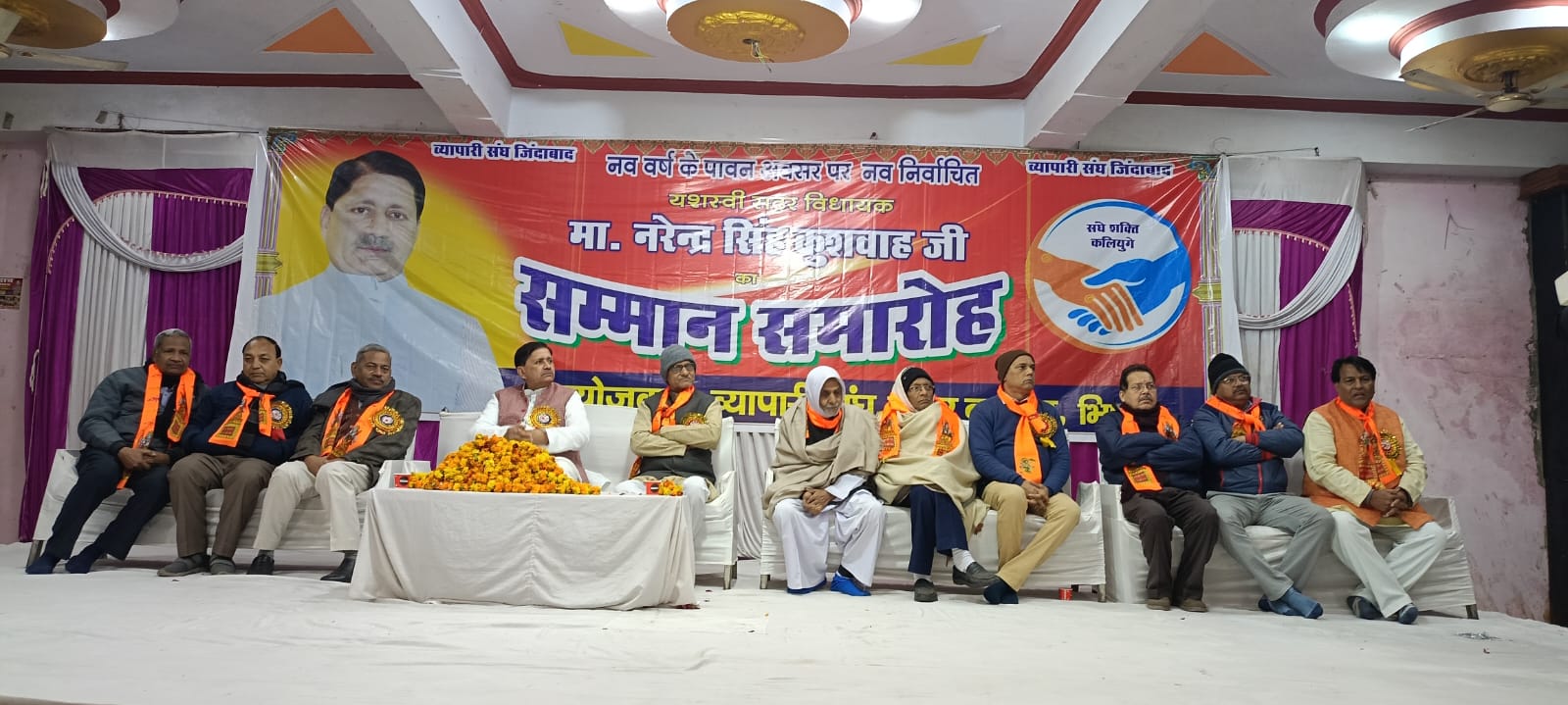 हर साल की तरह भिंड सदर बाजार के व्योपरियो की मीटिंग आयोजित की जा रही है इस बार नव वर्ष के पावन अवसर पर भिंड नगर के ऋषभ सत्संग भवन बतासा बाजार मैं नव निर्वाचित सदर विधायक नरेन्द्र सिंह कुशवाह जी का सम्मान समारोह दिनांक. 19 जनवरी को आयोजित किया गया जिसमे भिंड विधायक जी ने सुनी सदर बाजार व्योपरियो की समस्या जिस व्योपारी संघ जिलाध्यक्ष ओम प्रकाश बाबू जी ने भिंड सदर बाजार मैं सुरक्षा एवं सौंदरीकरण को लेकर बात भिंड विधायक से अग्रह किया जिसमे भिंड विधायक जी ने कहा भिंड व्योपरियो की सुरक्षा सौंदरीकरण एवं ठेले बालों के लिए दुकानों की व्यवस्था भी की जाएगी कार्यक्रम के पश्चात सभी व्योपरियो ने भिंड विधायक नरेंद्र सिंह का शाल सुफा एवं तलवार भेंट कर सम्मान किया जिसमे मुख्य रूप से मंच पर विराजमान अतिथि मैं ओम प्रकाश बाबू जी, जय प्रकाश रज्जु जैन, प्रमोद जैन डब्बू, हेम चंद्र जैन, विजय जैन, टिल्लू जैन, सहित सदर बाजार व्यापारी संघ उपस्थित रहा कार्यक्रमोपरांत स्नेह भोज का आयोजन किया गया है।