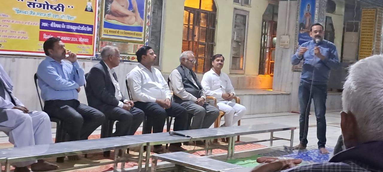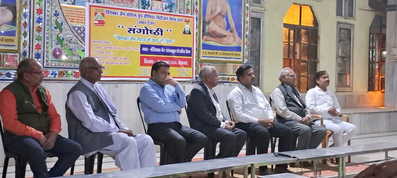 वर्तमान समय में समाज में व्याप्त बुराइयों एवं आधुनिकता की दौड में बढ़ रही विसंगतियां के संदर्भ में दिगंबर जैन सोशल ग्रुप सीनियर सिटीजन भिंड द्वारा शहर के श्री दिगंबर जैन परेड मंदिर में समाज की दशा और दिशा संगोष्ठी का आयोजन किया गया जिसमें समाज के वरिष्ठ जनों, शहर की विभिन्न सामाजिक संस्थाओं के पदाधिकारियों एवं समाज के अध्यक्ष और मंत्रियों ने अपने विचार व्यक्त किये कार्यक्रम के मुख्य अतिथि अशोक जैन तेल वाले एवं विशिष्ट अतिथि महावीर प्रसाद जैन धर्मेंद्र जैन पोस्ट ऑफिस, रविंद्र जैन, नरेश जैन मंचासीन रहे कार्यक्रम की अध्यक्षता ग्रुप अध्यक्ष डॉ. अनिल जैन द्वारा की गई। कार्यक्रम संयोजक डॉ एस. के. जैन ने कहा आज आधुनिकता और पाश्चात्य शैली का अनुसरण करते हुये हम अपनी प्राचीन संस्कृति को भूलते जा रहे हैं। इसी का परिणाम है आज समाज में काफी समस्याएं व्याप्त हो गई हैं आज अधिक उम्र तक युवक युवतियों का विवाह नहीं हो पा रहा है इसके दुष्परिणाम हमारे सामने आ रहे हैं आज समाज में आधुनिकता के नाम पर प्री वेडिंग सूट, बड़े-बड़े रिसॉर्ट और होटलों में शादी, शिक्षा और नौकरी के नाम पर बच्चों को खुली छूट देकर हमने सामाजिक संस्कृति और सभ्यता का पतन किया है आज इसके दुष्परिणाम हमारे सामने आ रहे हैं समाज के वरिष्ठ जनों को इस विषय में चिंतन करने की आवश्यकता है आज समाज में आधुनिकता के नाम पर प्री वेडिंग सूट और महंगे रिसोर्ट में कार्यक्रम आयोजित करना निश्चित ही समाज के पतन का कारण है।