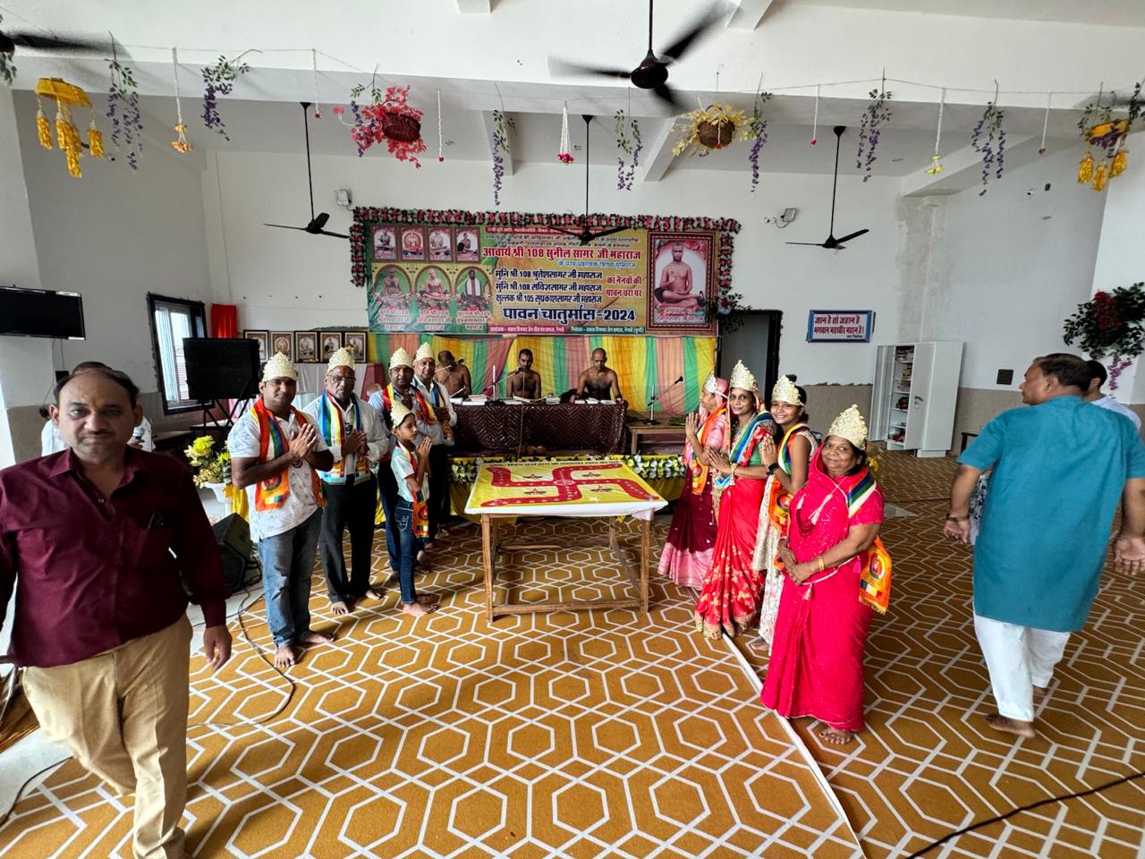 धर्म सभा से पूर्व भक्तामर स्तोत्र के पुनार्जन श्री सैष्टि प्रवीण कुमार महावीर कुमार अविनाश प्रियंक वेद सरावगी परिवार द्वारा दीप प्रज्वलित चित्र अनावरण समिति द्वारा तिलक माला पगड़ी पहनाकर स्वागत सम्मान किया गया
