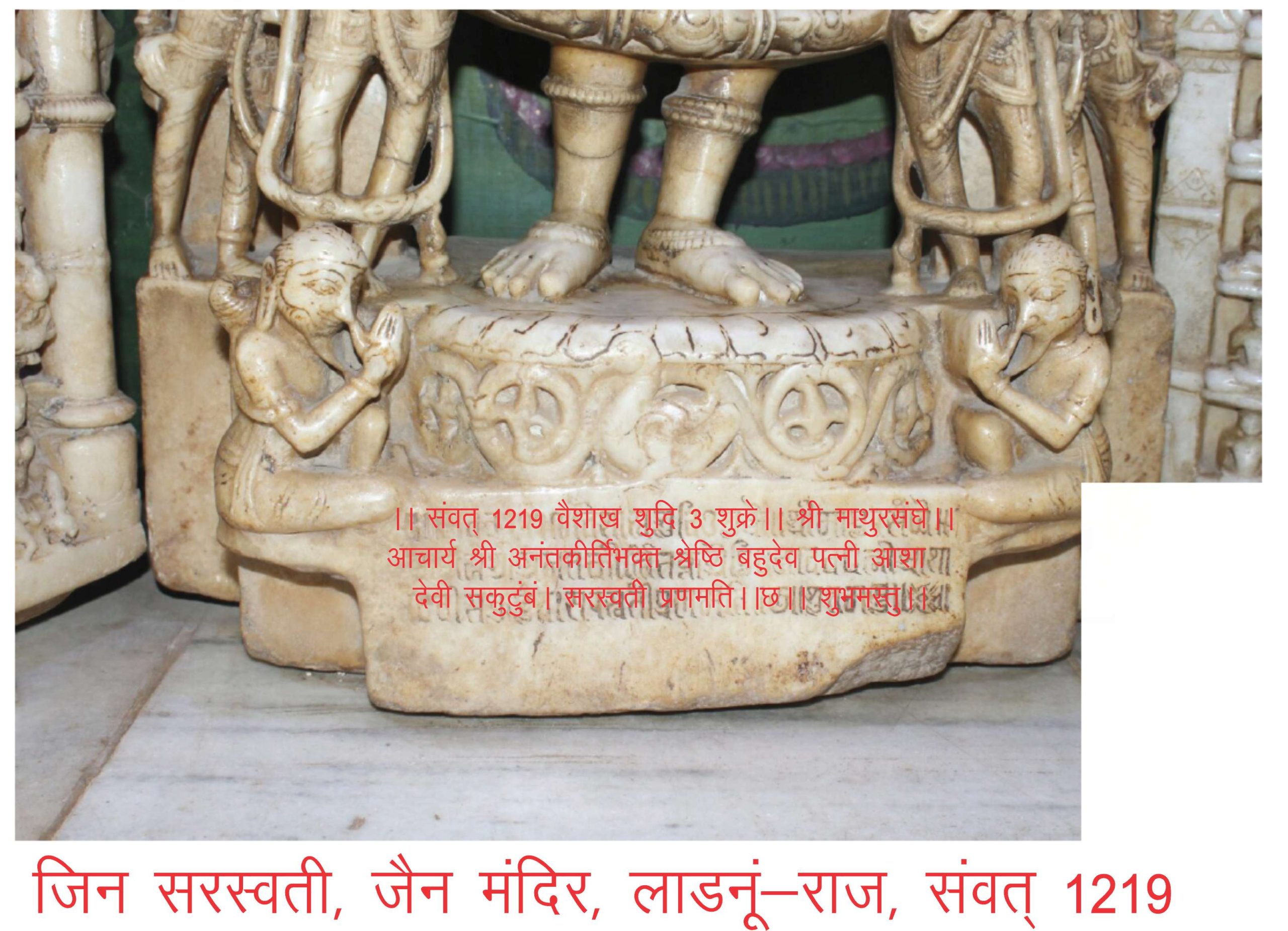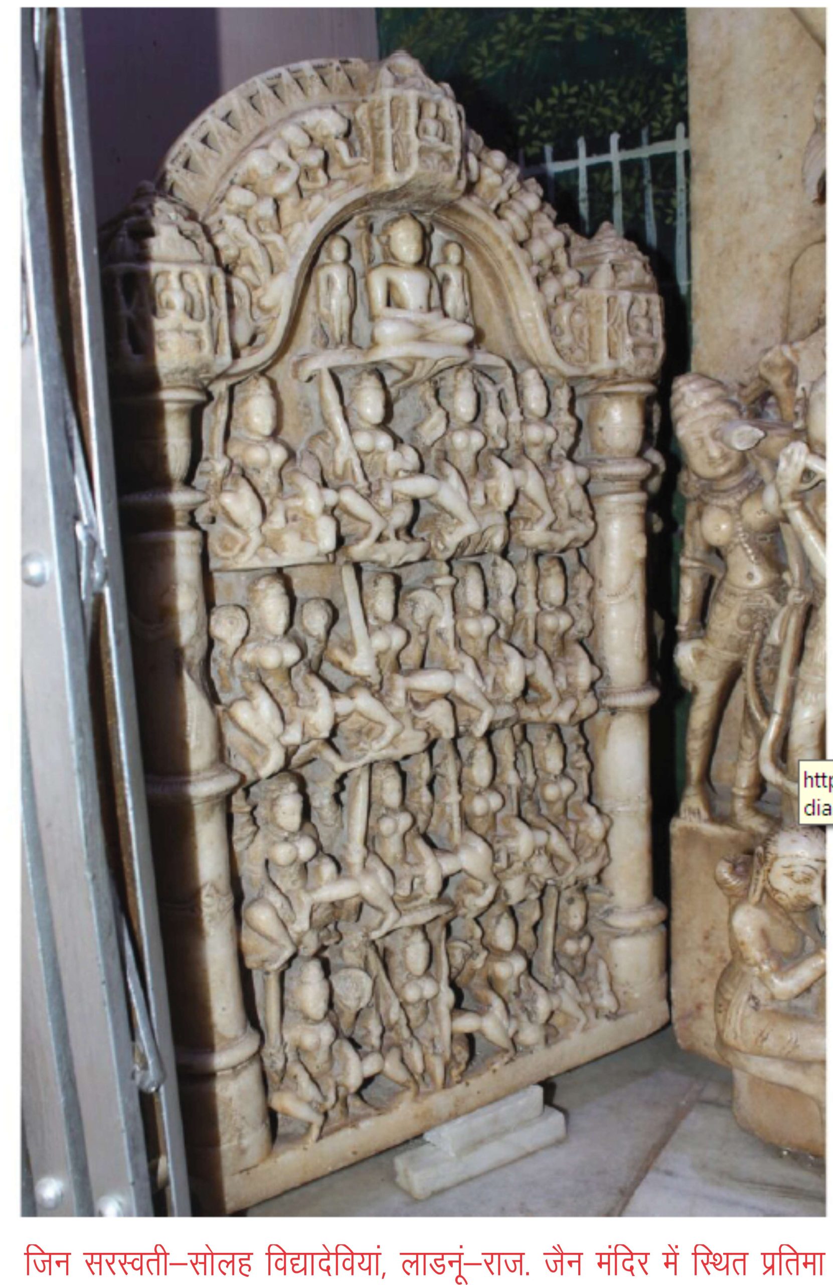 लाडनूं, राजस्थान के श्री दिगम्बर जैन बड़ा मंदिर में अभ्लििखित जिन सरस्वती प्रतिमा के निकट सोलह जिन विद्यादेवियों का शिलाफलक भी स्थापित है। अभिधानचिंतामणि में सोलह विद्यादेवियों के नाम इस प्रकार हैं- वाक्, ब्राह्मी, भारती, गौ, गी, वाणी, भाषा, सरस्वती, श्रुतदेवी, वचन, व्यावहार, भाषित और वचस भी कहा गया है। आचार्य बप्पभट्ट सूरिकृत चतुर्विंशतिका के अनुसार सोलह विद्यादेवियों के नाम इस प्रकार हैं- रोहिणी, प्रज्ञप्ति, वज्रश्रृंखला, जाम्बूनदा, काली, महाकाली, गौरी, गांधारी, ज्वालामालिनी, मानवी, वैरोटी, अच्युता, मानसी और महामानसी। किन्तु इनमें से कुछ को जिनशासन की चतुर्विंशति शासन देवी या यक्षिणियों में भी परिगणित किया गया है।
