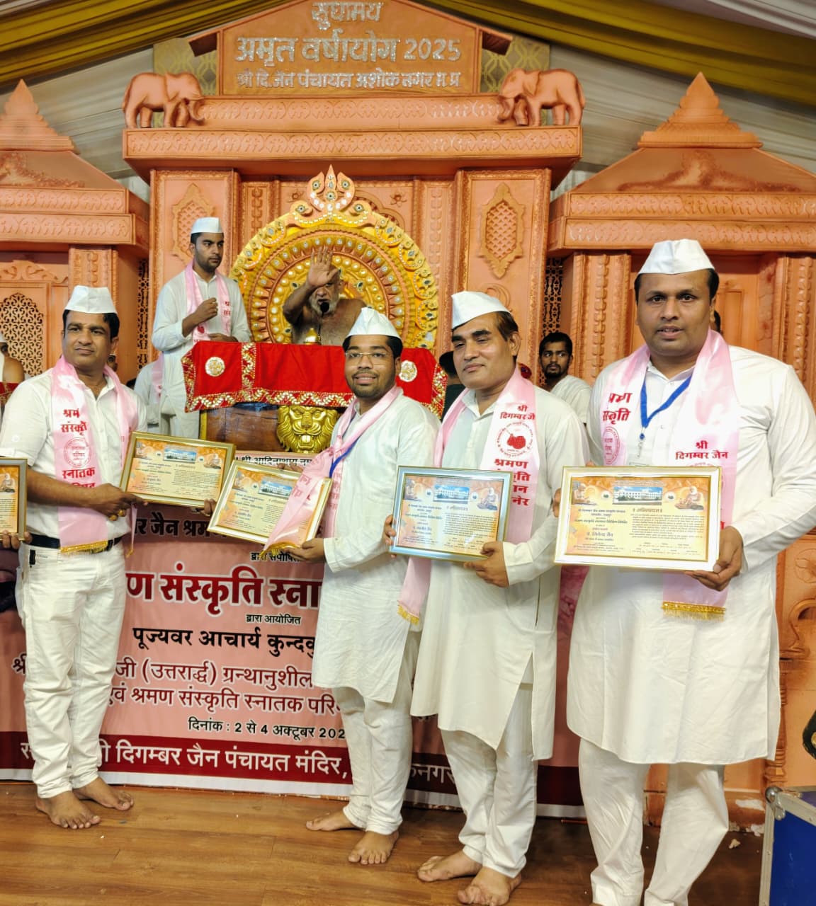 सेवा, समर्पण व आत्मीय वातावरण में बच्चों को धार्मिक संस्कारो से ओतप्रोत जैन धर्म की मौलिक शिक्षा प्रदान करने में महत्वपूर्ण भूमिका निभाने पर चम्बल संभाग के क्षेत्रीय शिविर प्रभारी एवं द्वादश वर्षीय पाठशाला के संयोजक के कुशल नेतृत्व में विद्वत श्री नवनीत जैन शास्त्री (मुरैना) को मुनि सुधासागर जी महाराज ने आशीर्वाद प्रदान किया। श्रमण संस्कृति संस्थान जयपुर के अध्यक्ष एसके जैन, कार्याध्यक्ष प्रमोद पहाड़िया, अधिष्ठाता जय कुमार जैन, व्याख्याता अरूण जैन व अधिष्ठात्री शीला डोडिया ने बतौर अतिथि साफा लगा, दुपट्टा ओढ़ाकर व प्रशस्ति पत्र देकर शास्त्री जी को सम्मानित किया।