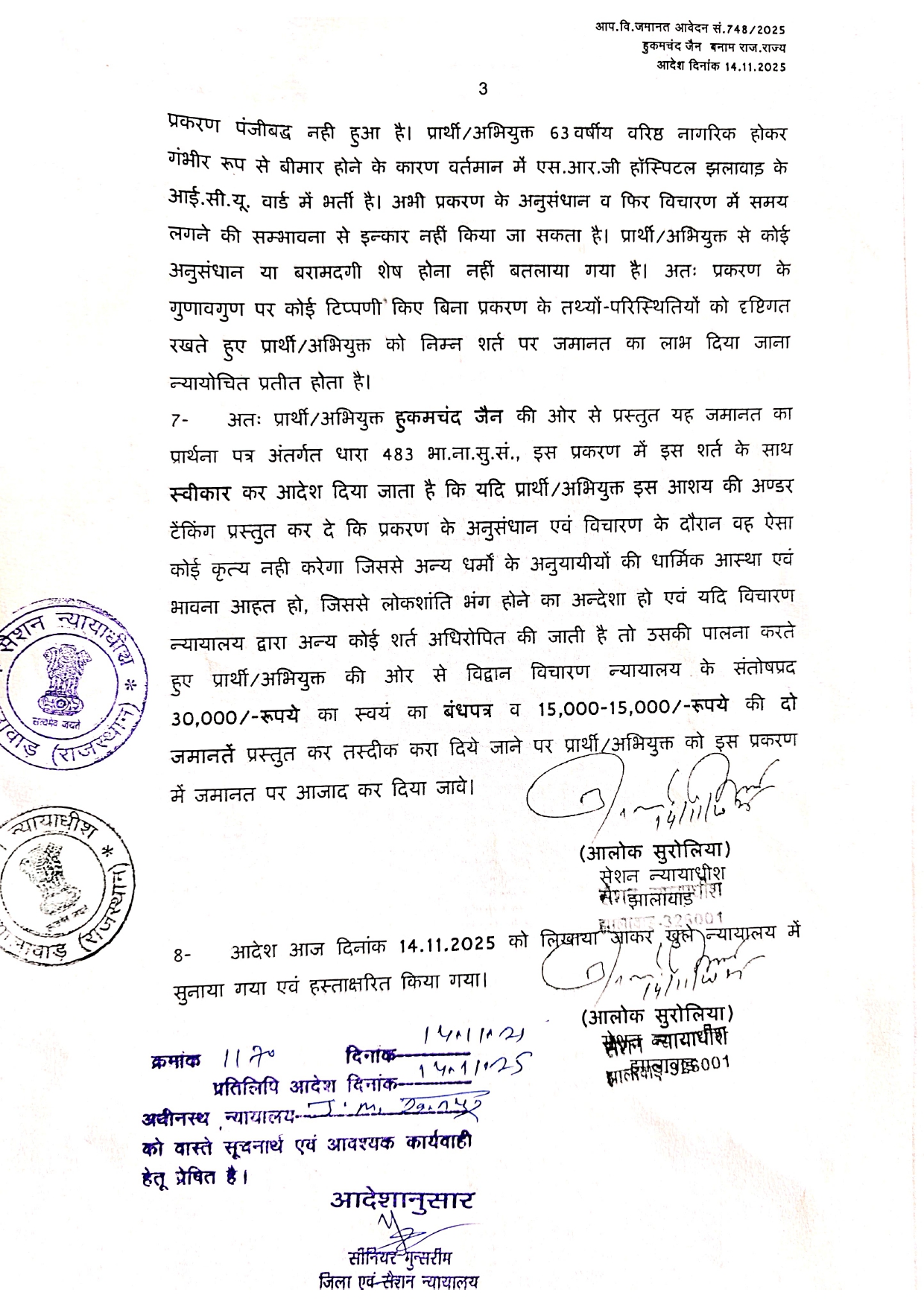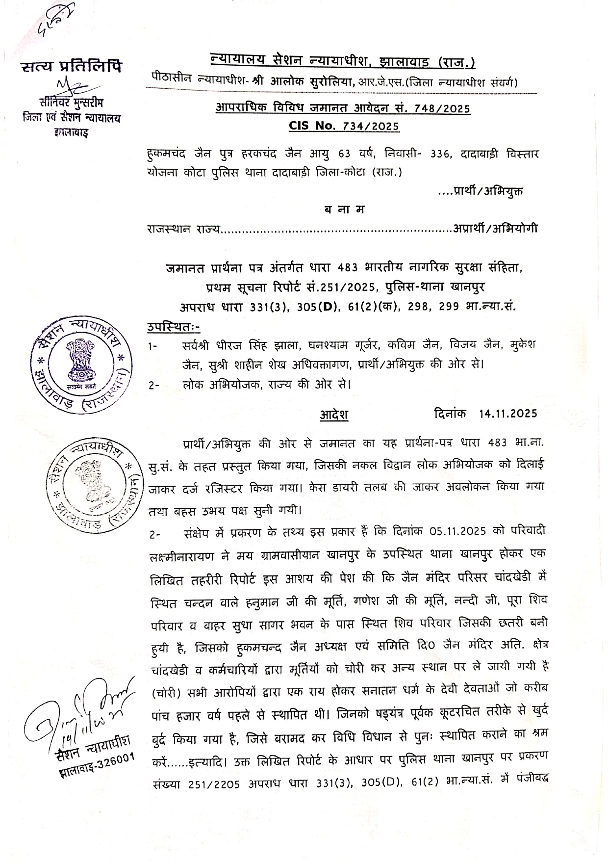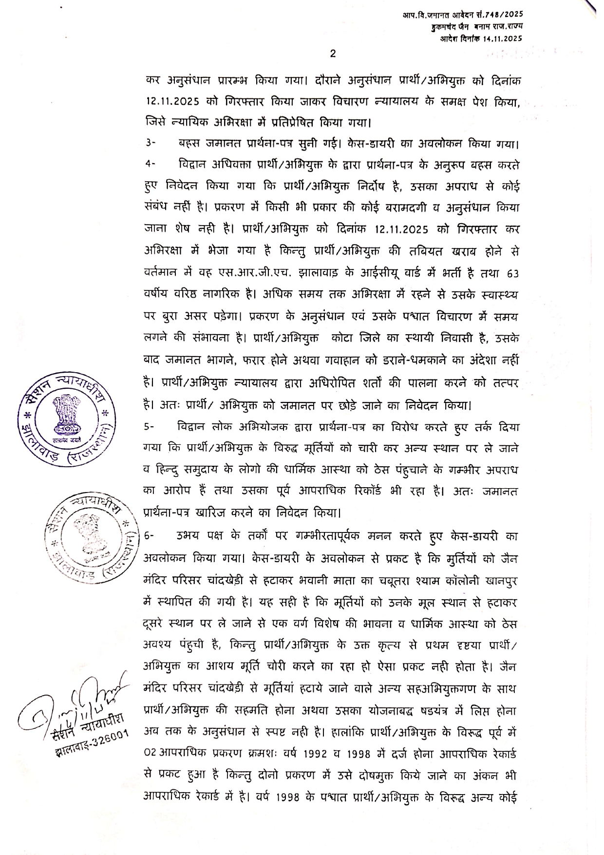 माननीय न्यायालय सेशन न्यायाधीश झालावाड़ के संलग्न जमानती आदेश दिनांक14.11.2025 की कंडिका क्रमांक 6 पर गौर करें
