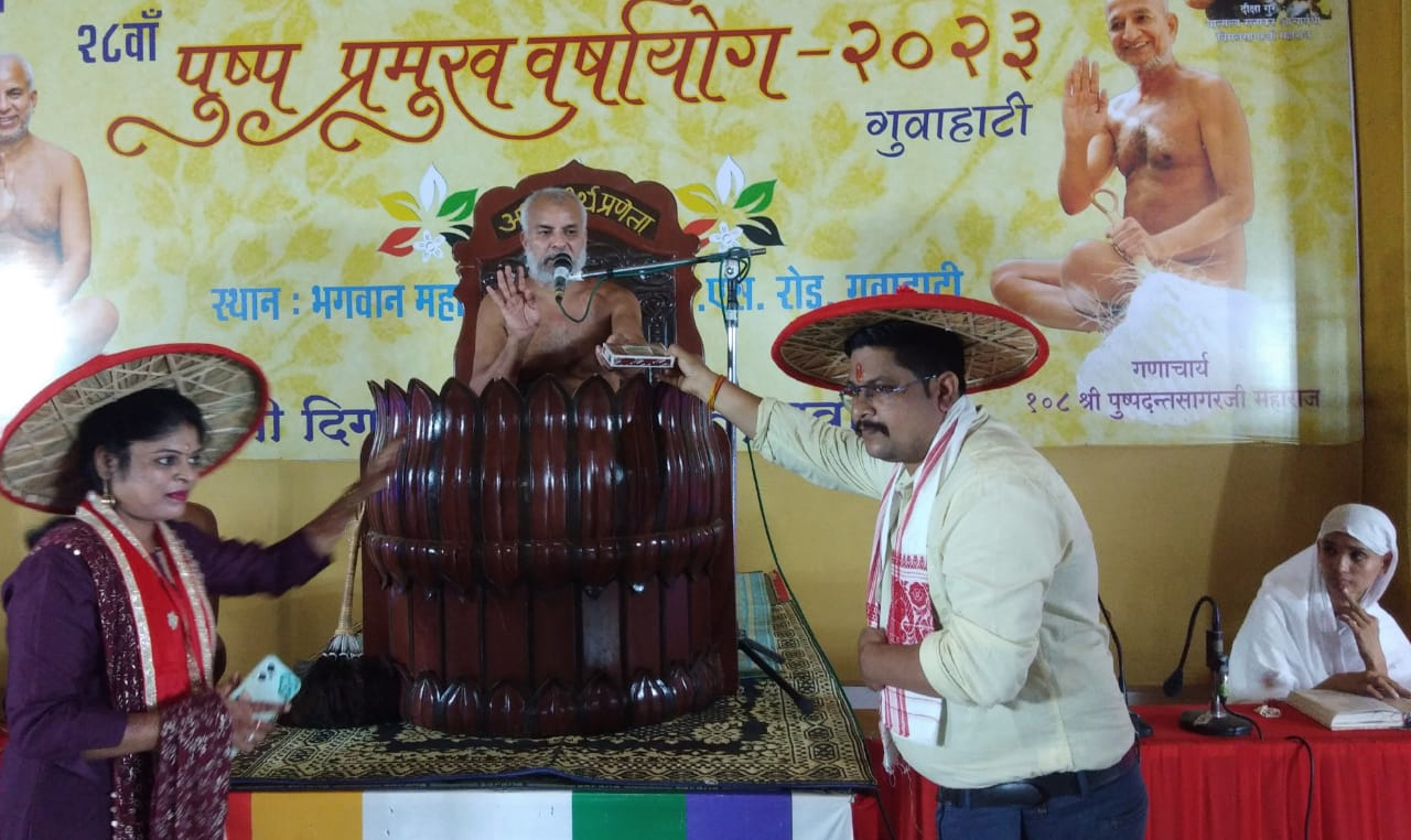 गुवाहाटी : स्थानीय फैंसी बाजार स्थित भगवान महावीर धर्मस्थल मे आज रविवार को आचार्य श्री प्रमुख सागर महाराज की 50वी स्वर्ण जयंती के उपलक्ष में विभिन्न धार्मिक कार्यक्रमों का आयोजन किया गया। कार्यक्रम का शुभारंभ समाज की महिला सदस्यों द्वारा मंगलाचरण से हुआ। तत्पश्चात उपस्थित अतिथियों ने आचार्य श्री पुष्पदंत सागर महाराज के चित्र का अनावरण कर दीप प्रज्वलन किया। तत्पश्चात पुण्याजक परिवार द्वारा आचार्य श्री का पाद प्रक्षालन किया गया। कार्यक्रम में विभिन्न राज्यों से पधारे गुरु भक्तों का समाज की ओर से अभिनंदन किया गया। इस अवसर पर आचार्य श्री ने उपस्थित श्रोताओं को संबोधित करते हुए कहा की कर्मो के आने को आर्सव कहते हैं, हमारी जैसी क्रिया होगी वैसा कर्म आएगा। शुभ क्रिया से पुण्य और अशुभ र्किया से पाप का आर्सव होता है। जैसे धर्म, कार्य, सोच आदि शुभ क्रियाएं से पुण्य का आर्सव होता है। और अधर्म , बुरे कार्य, गंदी सोच आदि अशुभ क्रियाएं से पाप का आर्सव होता है। आचार्य श्री ने कहा कि जो छोड़ता गया वह उठता गया और जो जोड़ता गया वह नीचे बैठता गया । *संसार में कौन आपके लिए क्या सोचता है, क्या बोलता है, क्या कहता है, क्या करता है, इस पर ध्यान ना देते हुए आपको क्या करना है, इस पर ध्यान दोगे तो परमात्मा से मिल पाओगे। *इससे पूर्व आज प्रातः श्री जी की शांतिधारा करने का परम सौभाग्य ताराचंद- कुसुम देवी छाबड़ा परिवार को प्राप्त हुआ।तत्पश्चात आचार्य श्री (ससंघ )के सान्निध्य मे पूजा ग्रुप (6.30 am) द्वारा चौसठ ऋदि महामंडल विधान का आयोजन किया गया *। इस अवसर पर *राम चंद्र सेठी के संयोजन में सायंकालीन आरती के पश्चात स्थानीय *पान बाजार की महिला सदस्यों द्वारा “मां की ममता” नामक “नाट्य” का आयोजन किया गया। कार्यक्रम में काफी संख्या में समाज के सदस्य उपस्थित थे।यह जानकारी समाज के प्रचार प्रसार विभाग के मुख्य संयोजक ओम प्रकाश सेठी सह संयोजक सुनील कुमार सेठी द्वारा दी गई है।