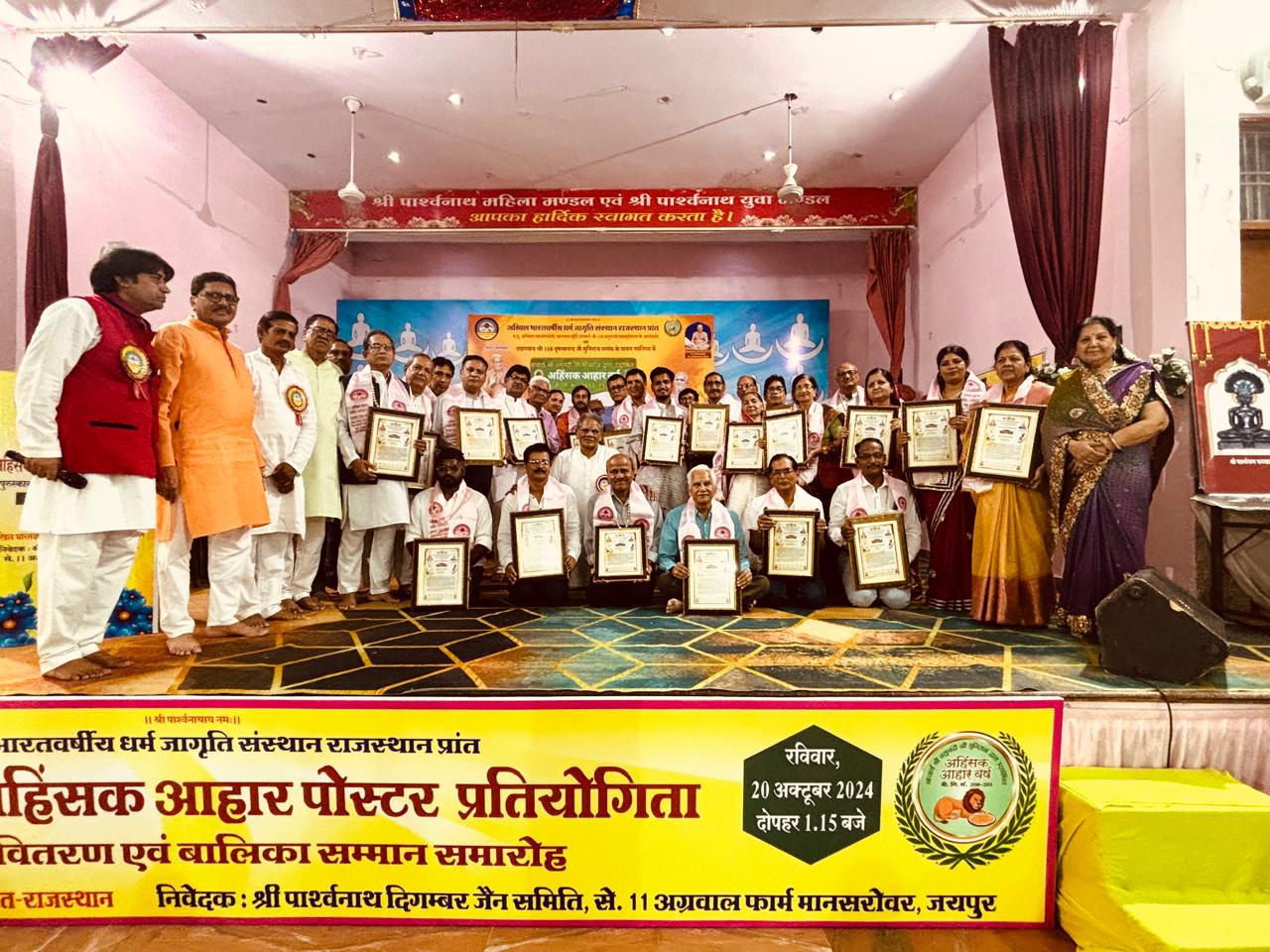 जयपुर – 20/10/24 ,धर्म जागृति संस्थान प्रान्त राजस्थान द्वारा आयोजित की गयी राज्य स्तरीय अहिंसक आहार पोस्टर प्रतियोगिता के रविवार को पुरस्कार वितरण एवं बालिका सम्मान समारोह का आयोजन उपाध्याय श्री १०८ वृषभा नन्द जी मुनिराज ससंघ के पावन सानिध्य में पार्श्वनाथ दिगम्बर जैन मंदिर थड़ी मार्किट जयपुर में किया गया ।