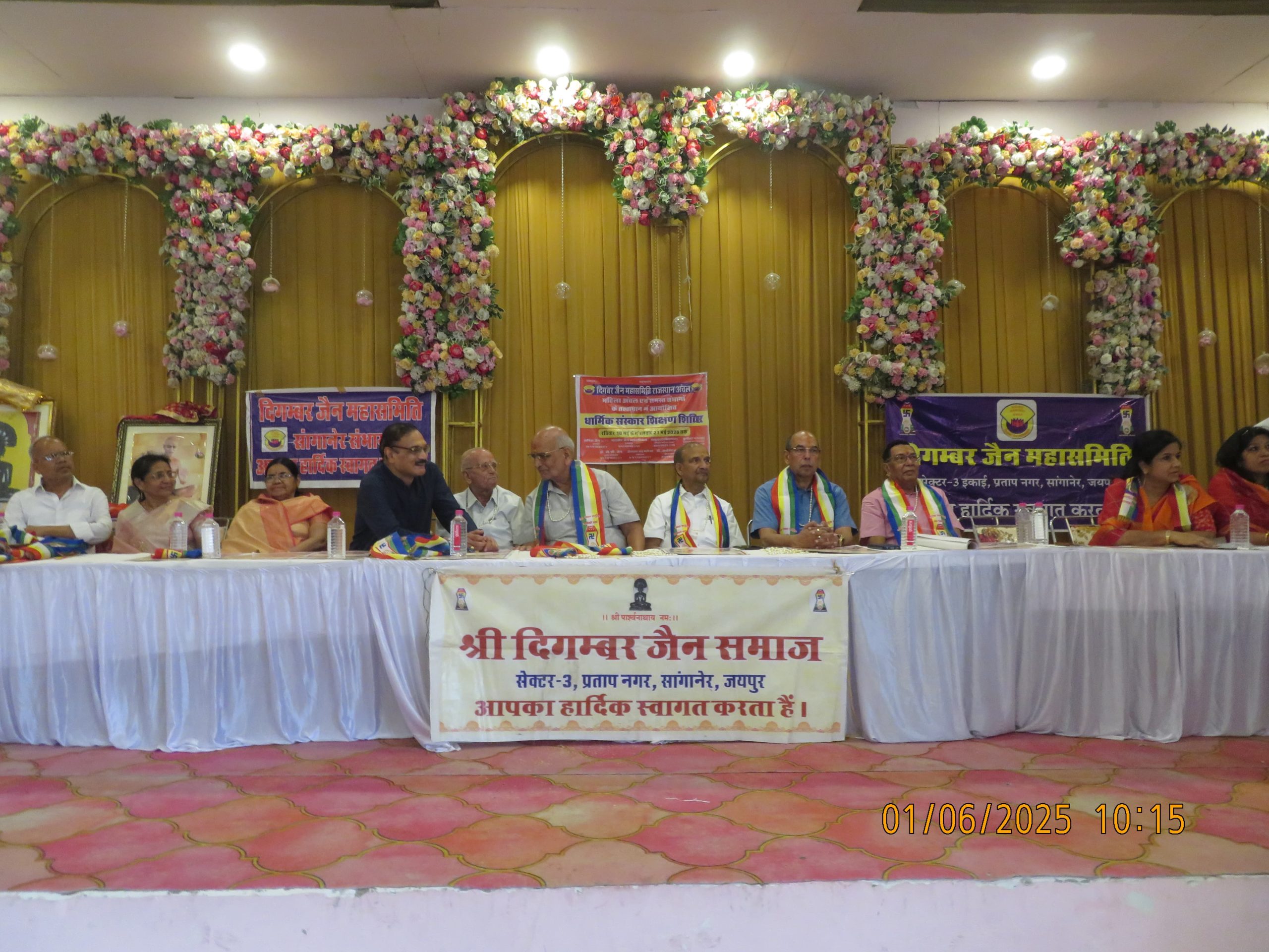 प्रतापनगर सेक्टर 3, जयपुर 1जून2025, रविवार को दिगम्बर जैन महासमिति राजस्थान अंचल द्वारा आयोजित ग्रीष्म कालीन संस्कार शिक्षण शिविर का समापन एवं पुरस्कार वितरण समारोह, प्रतापनगर सेक्टर 3 स्थित कृष्णा गार्डन के विशाल प्रांगण में सानंद सम्पन्न हुआ।इस अवसर पर इकाई अध्यक्ष सुरेन्द्र कुमार झांझरी ने बताया कि समारोह का शुभारंभ छोटे छोटे शिविरार्थियों द्वारा मंगलाचरण से किया गया।चित्र अनावरण – श्रीमती राजरानी बज, मातुश्री विजय अनीता बज एवं पूजा ग्रुप प्रतापनगर सेक्टर 3 द्वारा किये गये। श्रीमती मधु जैन मंदिर एवं संभाग महिला अध्यक्ष ने बताया कि जिनवाणी स्थापना -श्रीमति चांददेवी अजमेरा, ज्ञानदीप प्रज्ज्वलन- सुशील कुमार मैना देवी कासलीवाल ने किया।इस समारोह के मुख्य अतिथि एवं पुरस्कार वितरण कर्ता श्री गोपाल जी जैन, श्रीमती कमला देवी निवाई वाले रहे। कैलाश चंद जैन मलैया सांगानेर संभाग अध्यक्ष ने बताया कि आज के इस समारोह के अध्यक्ष राष्ट्रीय महासचिव सुरेन्द्र कुमार पांड्या रहे। राजस्थान अंचल अध्यक्ष अनिल कुमार जैन रिटायर्ड आईपीएस, महिला अंचल अध्यक्ष श्रीमती शकुंतला विन्दायका, महामंत्री महावीर कुमार बाकलीवाल, कार्याध्यक्ष डॉ णमोकार जैन, महिला मंत्री उर्मिला जैन, कोषाध्यक्ष मंजु जैन, संगठन मंत्री, आशीष पाटनी,संभागीय महिला मंत्री दीपा गोधा और टोंक संभाग अध्यक्ष नवीन कुमार जैन आदि ने अपनी सम्माननीय उपस्थिति दी। डॉ अरविन्द कुमार जैन ने बताया कि इस अवसर पर सांगानेर संभाग के समस्त इकाइयों के अध्यक्ष- मंत्रियों, मंदिर के अध्यक्ष -मंत्रियों और शिविर- प्रभारियों को मंच पर आमंत्रित करके इनके श्रेष्ठतम कार्यों हेतु सम्मानित किया गया। शिविर प्रभारी रश्मि एवं परिधि पाटनी ने बताया कि छोटे- छोटे बच्चों ने मनमोहक सांस्कृतिक प्रस्तुतियां प्रस्तुत कीं। संस्कार शिविर में शिक्षण कराने वाले विद्वानों में ब्रह्मचारी डॉ अनिल कुमार जैन प्राचार्य, श्रीमती कमलेश पाटोदी, सुप्रिया जैन, रेणु जैन, ईला जैन शाह, पंडित सुदीप गोयल, पंडित अभिषेक शास्त्री को सभी सभासदों ने तालियों की गड़गड़ाहट के साथ पुरस्कृत एवं सम्मानित किया गया। डॉ बी सी जैन ,राष्ट्रीय धार्मिक निदेशक ने बताया कि शिविरार्थियों में प्रथम, द्वितीय वालों को विशेष रूप से सम्मानित किया गया और शेष सभी को सांत्वना पुरस्कार से सम्मानित किया गया। अंत में इकाई अध्यक्ष झांझरी जी ने दस दिवसीय शिविर में प्रत्यक्ष एवं परोक्ष रूप से सहयोग करने वालों का आभार व्यक्त किया। कैलाश चंद जैन मलैया ने बताया कि कीर्ति नगर इकाई के अध्यक्ष श्री कैलाश चंद जी गोधा ने कार्यक्रम से प्रभावित होकर 5100₹ राशि की घोषणा की। और सांगानेर संभाग की इकाइयों से पधार