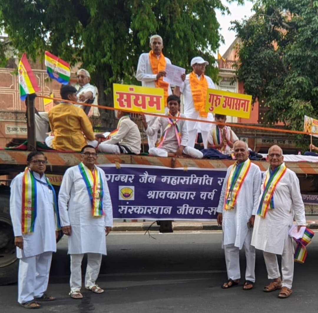 दिगम्बर जैन महासमिति अंचल राजस्थान द्वारा इस वर्ष श्रावकाचार वर्ष-2024 घोषित किया गया है। उसके अन्तर्गत इस श्रावकाचार झांकी निकाली गई। इस अवसर पर पदाधिकारियों द्वारा श्रावकाचार संकल्प-पत्र एवं श्रावकाचार फोल्डर का विचोचन एवं वितरण किया गया।