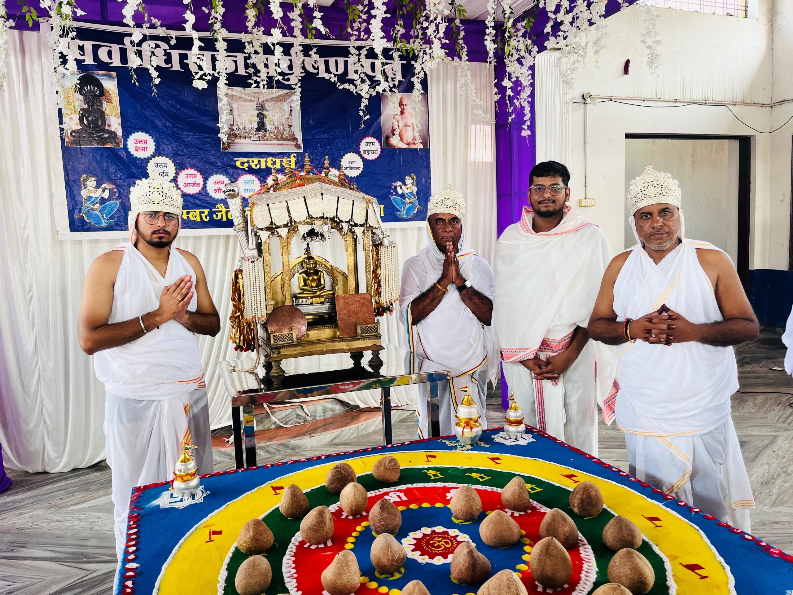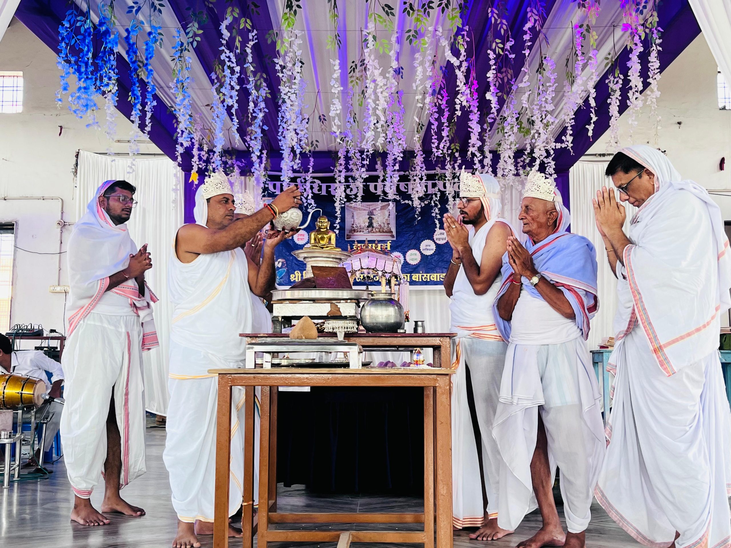 आयोजन स्थल पर आदिनाथ भगवान का जलाभिषेक अनिल कोठिया रजनी कोठिया के दस उपवास के उपलक्ष्य में आयुष, नमन कोठिया, बदामीलाल कोठिया, अजीत कोठिया, अशोक कोठिया, राजेंद्र कोठिया, अनिल कोठिया तथा प्रतिनव कोठिया परिवार ने किया। राजेंद्र कोठिया एवं धनपाल शाह के निर्देशन में देवशास्त्र गुरु पूजा, सिद्ध भगवान पूजा, षोडशकारण पूजा, पंच मेरु पूजा तथा रत्न त्रय पूजा पढ़ कर शांतिपाठ किया गया।