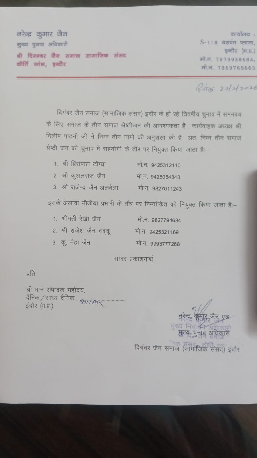 इंदौर, 22 फरवरी 2026: दिगंबर जैन समाज (सामाजिक संसद) इंदौर के आगामी 15 मार्च को होने वाले त्रिवर्षीय चुनाव को सुव्यवस्थित रूप से संपन्न कराने के लिए मुख्य चुनाव अधिकारी नरेंद्र कुमार जैन ने समन्वय हेतु समाज के तीन वरिष्ठ श्रेणीजन की नियुक्ति की है। जारी आदेश के अनुसार कार्यवाहक अध्यक्ष दिलीप पाटनी की अनुशंसा पर इन नामों को सहायक के रूप में नियुक्त किया गया है।