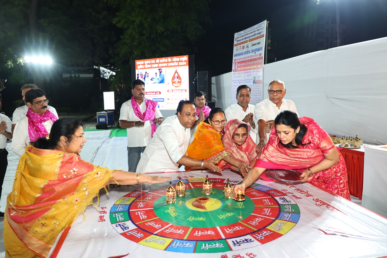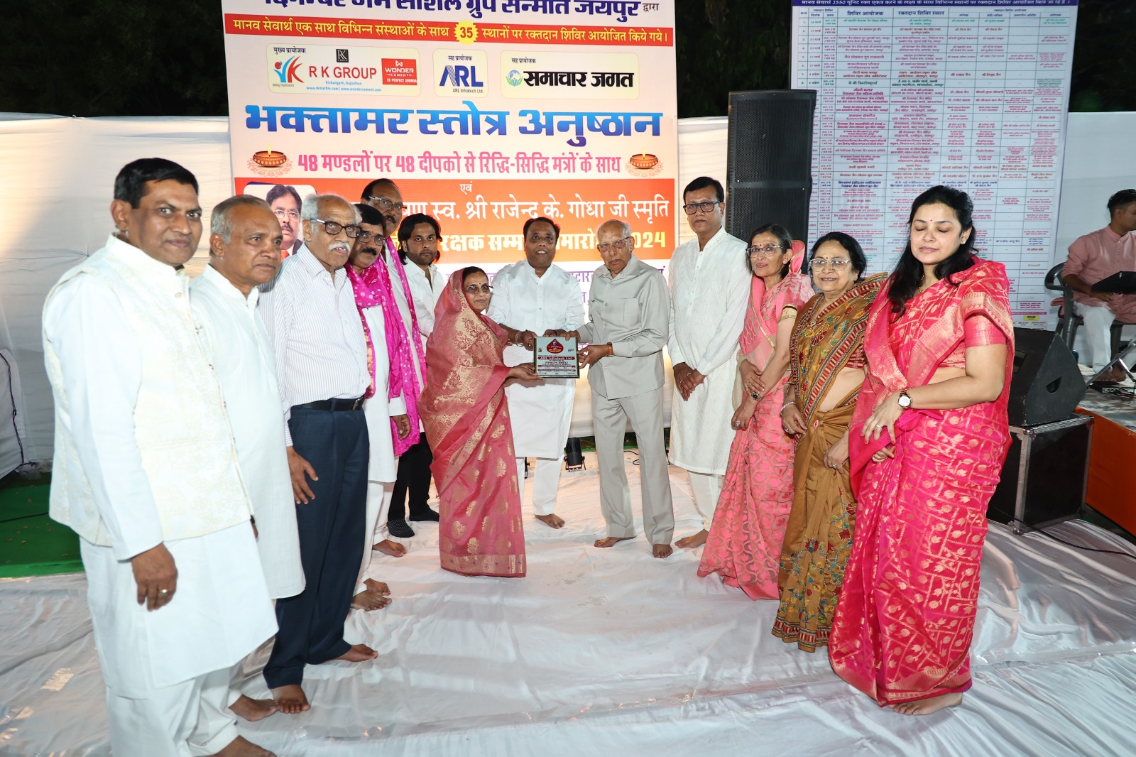 सन्मति अध्यक्ष मनीष लोंग्या एवम सचिव राजेश पाटनी के अनुसार इन सभी शिविरो में लगभग 1700 यूनिट रक्त एकत्र किया गया तथा सभी रक्तदाताओं को मुख्य प्रायोजक आर. के .मार्बल ग्रुप , सह प्रायोजक ए .आर .एल इंफ्राटेक व समाचार जगत के सहयोग से यातायात अवेयरनेस कार्यक्रम के अंतर्गत एक एक आई एस आई मार्का हेलमेट स्मृति स्वरूप भेट किया गया, कार्यक्रम में भक्तामर अनुष्ठान के साथ किया सहयोगी संस्थाओं का सम्मान कार्यक्रम में रीजन अध्यक्ष राजेश बड़जात्या एवम सचिव निर्मल संघी के अनुसार भट्टारक जी की नसिया नारायण सिंह सर्किल के छतरी वाले भाग में भव्य भक्तामर अनुष्ठान का शुभारंभ श्रीमती त्रिशला गोधा , शैलेंद्र गोधा समाचार जगत परिवार तथा नंदकिशोर- प्रमोद पहाड़िया ए .आर .एल परिवार ने दीप प्रज्ज्वलित करके किया। सन्मति संरक्षक सुरेंद्र पांड्या के अनुसार अनुष्ठान के अंतर्गत सभी 48 मंडलों पर रक्तदान शिविर आयोजन करने वाली सहयोगी संस्थाओं द्वारा 48 दीप प्रज्ज्वलित किए गए तथा मुख्य मंडल पर भी एक एक दीप प्रज्ज्वलित करवा कर उनको स्वर्गीय श्री राजेंद्र .के. गोधा स्मृति जीवन रक्षक सम्मान से सम्मानित किया गया।समारोह में सहयोगी संस्थाओं के सदस्यो के साथ साथ श्री महावीर जी कमेटी के अध्यक्ष सुधांशु कासलीवाल , वीर सेवक मंडल के अध्यक्ष महेश काला, राजस्थान जैन सभा के अध्यक्ष सुभाष चन्द्र जैन, कोषाध्यक्ष राकेश छाबड़ा, राजस्थान जैन युवा महासभा के संस्थापक अध्यक्ष ज्ञान चंद झांझरी,अध्यक्ष प्रदीप जैन, महामंत्री विनोद कोटखावदा सहित समाज के अनेक गणमान्य नागरिकों ने उपस्थिति होकर समारोह को सफल बनाया।