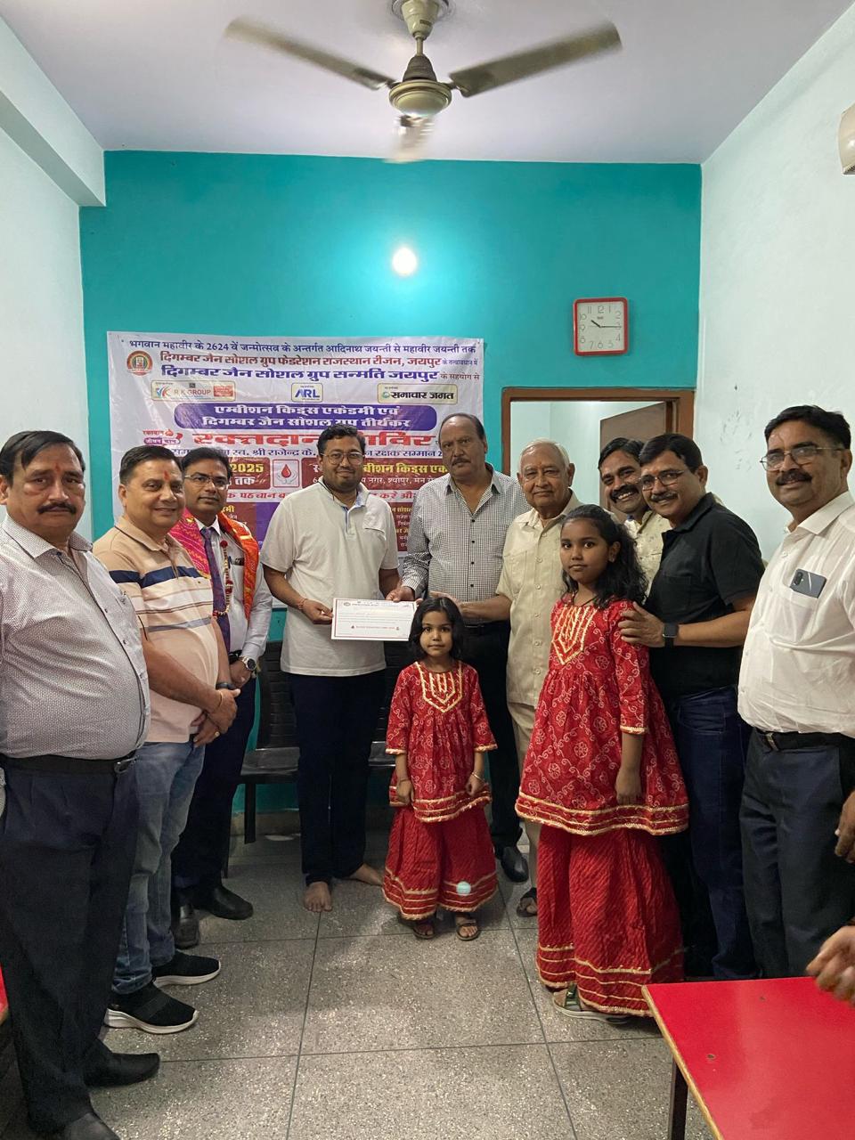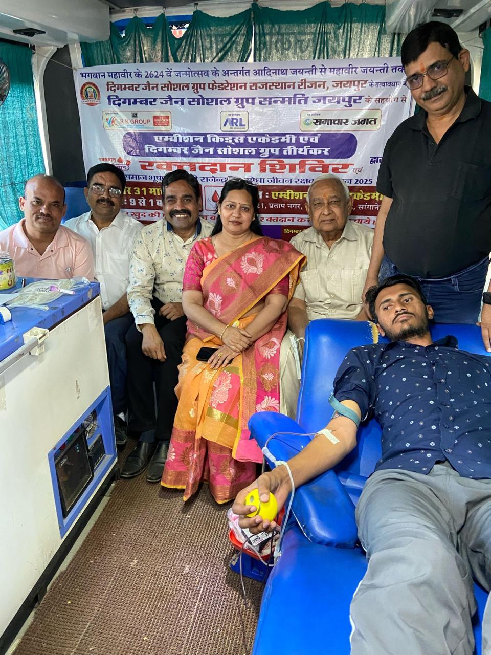 जयपुर शहर में दिगम्बर जैन सोशल ग्रुप तीर्थंकर, एंबीशन किड्स एकेडमी एवं इंटरनल हॉस्पिटल, सांगानेर जयपुर के संयुक्त तत्वाधान में श्योपुर रोड स्थित एंबीशन किड्स परिसर में ब्लड डोनेशन एवं मेडिकल हेल्थ चेकअप कैंप लगाया गया। इस शिविर का उद्घाटन दिगंबर जैन सोशल ग्रुप फेडरेशन इंदौर के नव नियुक्त राष्ट्रीय मीडिया प्रभारी एवं शाबाश इंडिया के प्रधान संपादक राकेश गोदीका तथा दिगंबर जैन सोशल ग्रुप तीर्थंकर के अध्यक्ष एवं अन्तरराष्ट्रीय ख्यातिप्राप्त वरिष्ठ होम्योपैथ डॉ एम एल जैन ” मणि ” – डॉ शांति जैन ” मणि “तथा इटर्नल हॉस्पिटल सांगानेर के निदेशक एवं वरिष्ठ हृदय रोग विशेषज्ञ डॉ सुप्रिय जैन के संयुक्त कर कमलो से संपादित हुआ,इस शिविर में लगभग 311 मरीजों ने लाभ उठाया तथा 29 यूनिट ब्लड एकत्रित हुआ। इससे पूर्व संस्थान अध्यक्ष एवं अन्तरराष्ट्रीय वरिष्ठ होम्योपैथ डॉ एम एल जैन ” मणि ” एवं तीर्थंकर ग्रुप के सचिव सुरेश गंगवाल द्वारा अतिथियों को तिलक, माला, साफा और दुपट्टा ओढ़ाकर सम्मानित किया। इस कार्यक्रम के संयोजक संदीप जैन ने बताया कि इस शिविर में इटरनल हॉस्पिटल के सीनियरकार्डियोलॉजिस्ट डॉ सुप्रिय जैन के अतिरिक्त डॉ अभिषेक गोयल, डॉ दिवांशु खटाना, डॉ दीपाली जैन आदि विशेषज्ञों ने भी अपनी निशुल्क सेवाएं प्रदान की तथा शिविर में ई सी जी ,ब्लड प्रेशर, ब्लड शुगर, बीएमआई तथा आंखों की निशुल्क जांचे भी की गई कार्यक्रम में उपाचार्या अनीता जैन ने बताया कि इस शिविर में एंबीशन किड्स एकेडमी के सभी विद्यार्थियों के लिए संपूर्ण चेकअप की व्यवस्था भी की गई तथा इसके अतिरिक्त एंबीशन किड्स एकेडमी के अभिभावकों, टीचिंग व नॉन टीचिंग स्टाफ सदस्यों और उनके परिवार जनों ने भी इस शिविर में बढ़-कर कर हिस्सा लिया और रक्तदान शिविर में पूर्ण सहयोग किया। इससे पूर्व शिविर काअवलोकन दिगंबर जैन सोशल ग्रुप फेडरेशन राजस्थान रीजन के नव नियुक्त अध्यक्ष श्री सुनील बज एवं पूर्व अध्यक्ष श्री राजेश बडजात्या एवं ब्लड डोनेशन केम्प के मुख्य समन्वयक श्री दर्शन बाकलीवाल, अपेक्स हॉस्पिटल के निदेशक डॉ एस एल जैन ” पंकज ” , सुरेश बाकलीवाल, डा श्रेय जैन आदि गणमान्य व्यक्तियों ने किया एवं आयोजकों की इस पुण्य कार्य के लिए भूरी भूरी प्रशंसा एवं सराहना की। प्राचार्या डॉ अलका जैन ने बताया की रक्तदान शिविर में प्रत्येक रक्तदाता को आयोजकों की ओर से प्रशस्ति पत्र एवं मोमेन्टो देकर सम्मानित किया।