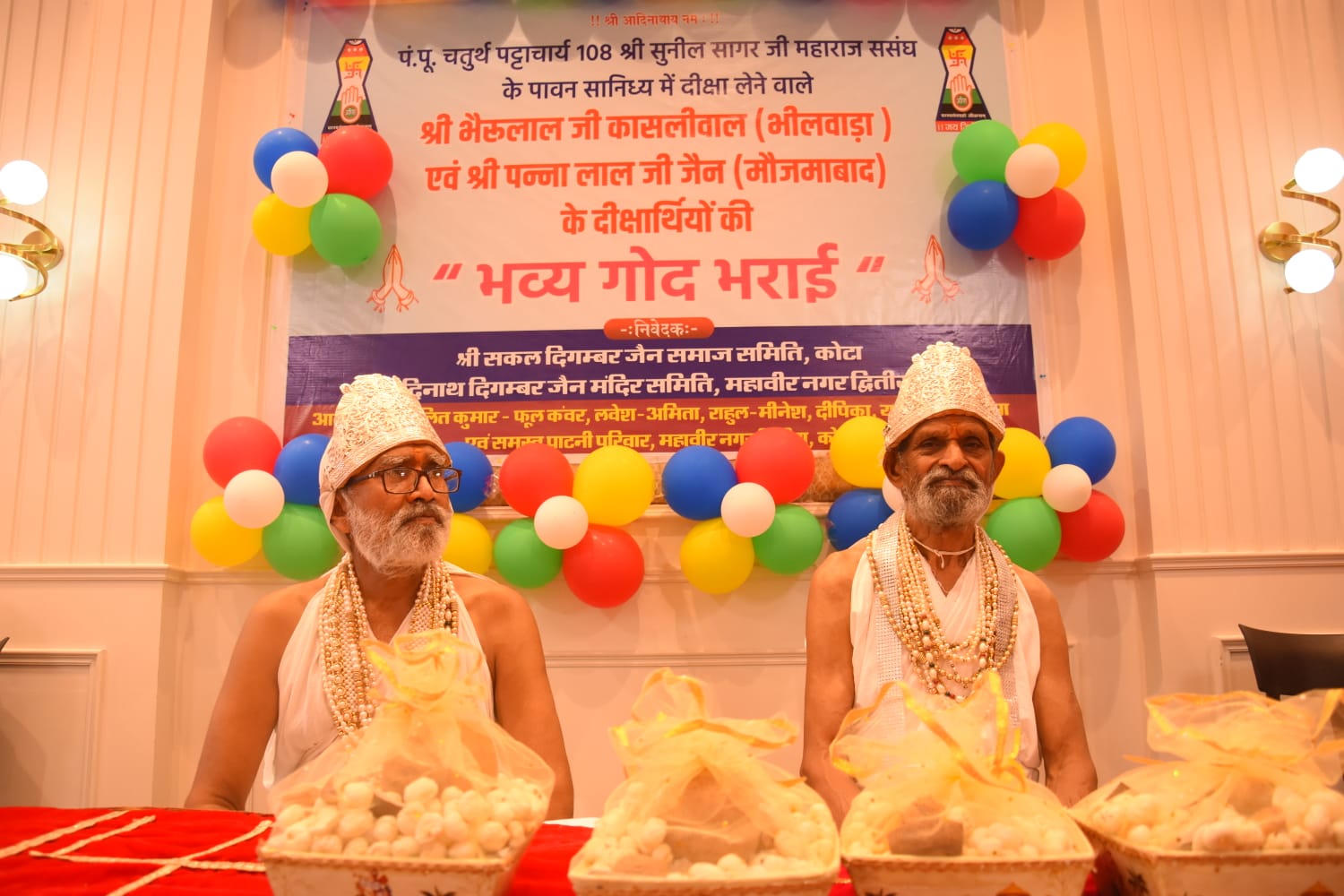 प्रात: 8.00 बजे ललित-फूलकँवर जैन एवं समस्त पाटनी परिवार,पारस सदन 1063, महावीर नगर द्वितीय के आवास पर गोद भराई की गई उसके बाद दोनो ब्रह्मचारी भाइयों को बग्धि में बिठाया गया।गाजे बाजे के साथ विभिन्न चौराहों से होते हुए मंदिर के समीप स्थित संत भवन में लाया गया। जहां पर सकल दिगंबर जैन समाज समिति के अध्यक्ष विमल जैन नांता कार्याध्यक्ष जे के जैन पारस जैन पत्रिका विकास जैन त्रिलोक जैन ललित जैन राजकुमार जैन पारस जैन पार्श्वमणि सहित सैकड़ों श्रद्धालुओं ने गोद भराई की रस्म भाव पूर्ण की। सभी की अल्पाहार की की व्यवस्था की गई।विदित हो कि 35 वर्षो से जैन पत्रकारिता के क्षेत्र में उल्लेखनीय योगदान देने वाले पारस जैन पार्श्वमणि को दोनो ब्र. भाईयो में सिर पर हाथ रखकर प्रसन्नचित मुद्रा में जैन धर्म प्रभावना के लिए मंगल आशीर्वाद प्रदान किया।