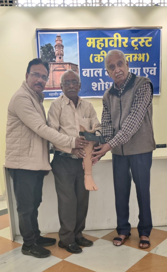 महावीर ट्रस्ट बाल कल्याण एवं शोध संस्थान केंद्र (कीर्ति स्तंभ) इंदौर पर आज मानव सेवा के अंतर्गत दिगंबर जैन सोशल ग्रुप फेडरेशन के राष्ट्रीय अध्यक्ष श्री मनोहर जी झांझरी, रीजन सचिव श्री संजय जी पापडीवाल, प्रबंधक ललित राठौर द्वारा एक दिव्यांग बंधु को क्रत्रिम पैर प्रदान किया गया।धर्म समाज प्रचारक राजेश जैन दद्दू ने कहा कि महावीर ट्रस्ट वर्षों से निरंतर अपनी शैक्षणिक, पारमार्थिक, रचनात्मक, सामाजिक गतिविधियों को संचालित किए हुए हैं ।