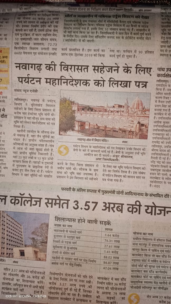 कमेटी के प्रचारमंत्री डॉ सुनील संचय ने बताया कि पिछले दिनों नवागढ़ में पर्यटन विभाग ने बुंदेलखंड विरासत सहेजने के लिए जिला प्रशासन से चार हेक्टेयर भूमि मांगी थी। इस संबंध में नवागढ़ कमेटी ने डीएम , अपर जिलाधिकारीको एक ज्ञापन भी दिया गया जिसमें ग्राम नवागढ़ (नावई) के पास राजस्व ग्राम सोजना में बुन्देली विरासत निर्माण हेतु आवंटित भूमि का स्वामित्व पर्यटन विभाग उ०प्र० के नाम कराकर आवंटित भूमि का Chang of land use की प्रकिया पूर्ण कराये जाने वावत् मांग की गईं तथा नवागढ़ की विरासत को संरक्षण और संवर्द्धन की मांग की गई।