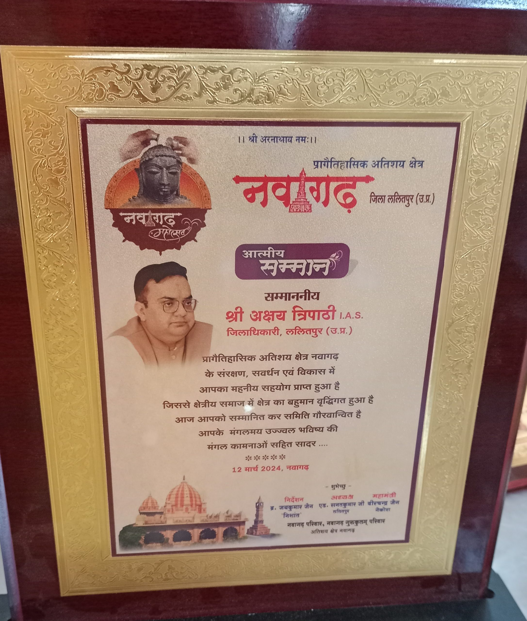 ललितपुर। महरौनी विकासखंड के सौजना के पास स्थित प्रागेतिहासिक श्री दिगम्बर जैन अतिशय क्षेत्र नवागढ़ की कमेटी ने शुक्रवार को ललितपुर जिलाधिकारी श्री अक्षय त्रिपाठी का सम्मान करते हुए उन्हें नवागढ़ क्षेत्र के दर्शन एवं पर्यटन स्थलों के अवलोकन हेतु आमंत्रित किया ,जिसे स्वीकारते हुए उन्होंने यथाशीघ्र आने का आश्वासन दिया।