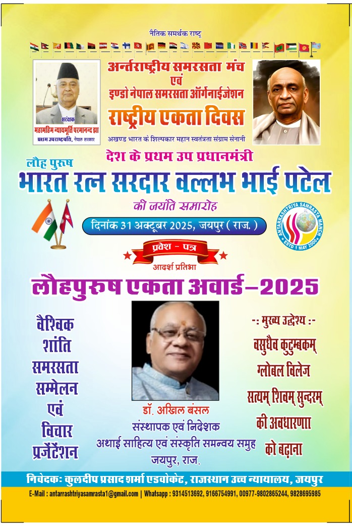 जयपुर/अंतर्राष्ट्रीय समरसता मंच एवं इंडो नेपाल समरसता आर्गेनाइजेशन के तत्वावधान में राष्ट्रीय एकता दिवस के अवसर पर संयुक्त राष्ट्र स्थापना दिवस समापन महोत्सव का आयोजन 31 अक्टूबर 2025 को जयपुर में किया जा रहा है । इस अवसर पर भारत रत्न सरदार वल्लभभाई पटेल की जयंती समारोह में लोह पुरुष एकता अवार्ड से सम्मान अभिनंदन का कार्यक्रम भी होने जा रहा है। वैश्विक शांति समरसता और विचार प्रेजेंटेशन में शिक्षा, चिकित्सा, न्याय ,समाज सेवा, पत्रकारिता, औद्योगिक सेवा, प्रशासनिक सेवा एवं साहित्यिक सेवाओं की चयनित प्रतिभाओं में राजस्थान के वरिष्ठ पत्रकार एवं साहित्यकार डॉ अखिल जैन बंसल को लोह पुरुष एकता अवार्ड से सम्मानित किया जाएगा। संगठन के सांस्कृतिक सचिव विवेक स्वामी ने बताया कि चयन समिति ने डा.अखिल जैन बंसल को चयनित किया गया। डॉ बंसल ने साहित्य एवं संस्कृति समन्वय समूह के माध्यम से कलमकारों की प्रतिभा उजागर कर उन्हें मंच प्रदान कर उल्लेखनीय कार्य किया है। पत्रकारिता के क्षेत्र में भी 50 वर्ष तक निरंतरता बनाए रखे है व समन्वय वाणी का पाक्षिक संपादन व प्रकाशन कार्य विगत 45 वर्षों से निरंतर करते आ रहे हैं। आपकी साहित्यि व पत्रकारिता क्षेत्र में उल्लेखनीय योगदान के लिए 20 से अधिक पुरस्कार प्राप्त कर चुके हैं उसी कड़ी में अब आप को लौह पुरुष एकता अवार्ड से सम्मानित किया जा रहा है। इस विशेष उपलब्धि पर समंग्र जैन समाज गौरवान्वित हुआ आप की इस उपलब्धि पर इंदौर दिगम्बर जैन समाज के वरिष्ठ समाजसेवी डॉ जैनेन्द्र जैन महावीर ट्रस्ट के अध्यक्ष अमित कासलीवाल हंसमुख गांधी टीके वेद मंयक जैन जीवन लाल जैन नागदा एवं फेडरेशन की राष्ट्रीय शिरोमणि संरक्षिका पुष्पा कासलीवाल रेखा जैन श्रीफल श्रीमती मुक्ता जैन आदि समाज जन ने बंधाई दी।