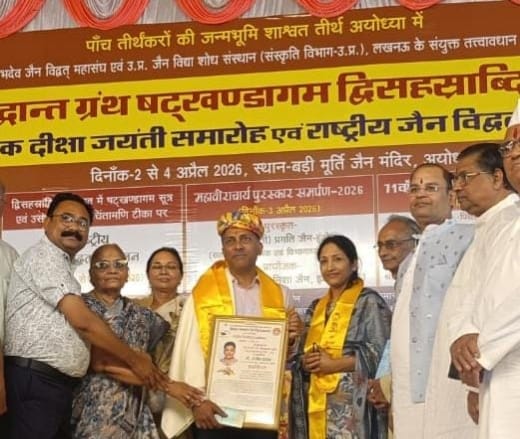 अयोध्या (सागर) /- 500 से ज्यादा ग्रंथों की रचिता, जैन धर्म की 92 वर्ष की सर्वोच्च साध्वी परम पूज्य गणिनि प्रमुख आर्यिका श्री ज्ञानमती माताजी के मंगल सानिध्य में तीर्थंकर ऋषभदेव जैन विद्वत महासंघ द्वारा बड़ी मूर्ति जैन मंदिर अयोध्या में आयोजित राष्ट्रीय जैन सम्मेलन एवं अखिल भारतवर्षीय दिगम्बर जैन युवा परिषद के 50वें स्वर्ण जयंती समारोह एवं अवार्ड समर्पण के अवसर पर सागर यूनिवर्सिटी के पू्र्व छात्र, पूर्व डिप्टी लाइब्रेरियन और वर्तमान में बनारस हिंदू विश्वविद्यालय में पदस्थ डॉ. संजीव सराफ को जिनवाणी की सेवा में समर्पित योगदान के कारण जिनवाणी गौरव अवार्ड से सम्मानित किया गया। अवार्ड में इक्कीस हजार की नगद राशि, शाल, श्रीफल, ग्रन्थ, स्मृति चिह्न देकर सम्मानित किया गया। इस समारोह में शास्वत तीर्थ अयोध्या की श्री दिगंबर जैन तीर्थक्षेत्र कमेटी के पीठाधीश स्वस्ति श्री रविंद्रकीर्ति स्वामी जी, न्यायमूर्ति श्रीमती विमला जी जैन भोपाल , सुरेश जैन आईएएस भोपाल, आई आई टी रुड़की के प्रो. अशोक जैन, राष्ट्रीय तकनीकी संस्थान पटना के डायरेक्टर प्रो. पी. के. जैन, इंदौर यूनिवर्सिटी के डॉ. अनुपम जैन, बनारस हिंदू विश्वविद्यालय के प्रो. आशाराम त्रिपाठी एवं प्रो. आनंद वर्धन शर्मा, उत्तर प्रदेश की संस्कृति मंत्रालय के जैन विद्या शोध संस्थान के उप अध्यक्ष प्रो. अभय कुमार जैन, इंदौर यूनिवर्सिटी की पूर्व कुलपति प्रो. रेणु जैन, राजस्थान यूनिवर्सिटी के पूर्व कुलपति प्रो. राजीव जैन, महासंघ महामंत्री विजय कुमार जैन, डॉ. जीवन प्रकाश जैन, हसमुख गांधी जैन, बुंदेलखंड मेडिकल कॉलेज के डॉ. संजय जैन सहित अनेक गणमान्य महानुभावों की उपस्थिति रही। डा. संजीव सराफ को इस महत्वपूर्ण अवार्ड से सम्मानित होने पर भारतवर्षीय दिगम्बर जैन तीर्थक्षेत्र कमेटी मध्यांचल के प्रचार प्रमुख एवं जैन तीर्थ नैनागिरि ट्रस्ट कमेटी के मंत्री व द्रोणगिरि सिद्धक्षेत्र के उपाध्यक्ष राजेश जैन रागी, द्रोणगिरि सिद्धक्षेत्र के ट्रस्ट मंत्री सुनील घुवारा, प्रबंध मंत्री सनत कुमार कुटोरा, प्राचार्य सुमतिप्रकाश सहित अनेक गणमान्य महानुभावों ने बधाई शुभकामनाएं प्रेषित की है।
