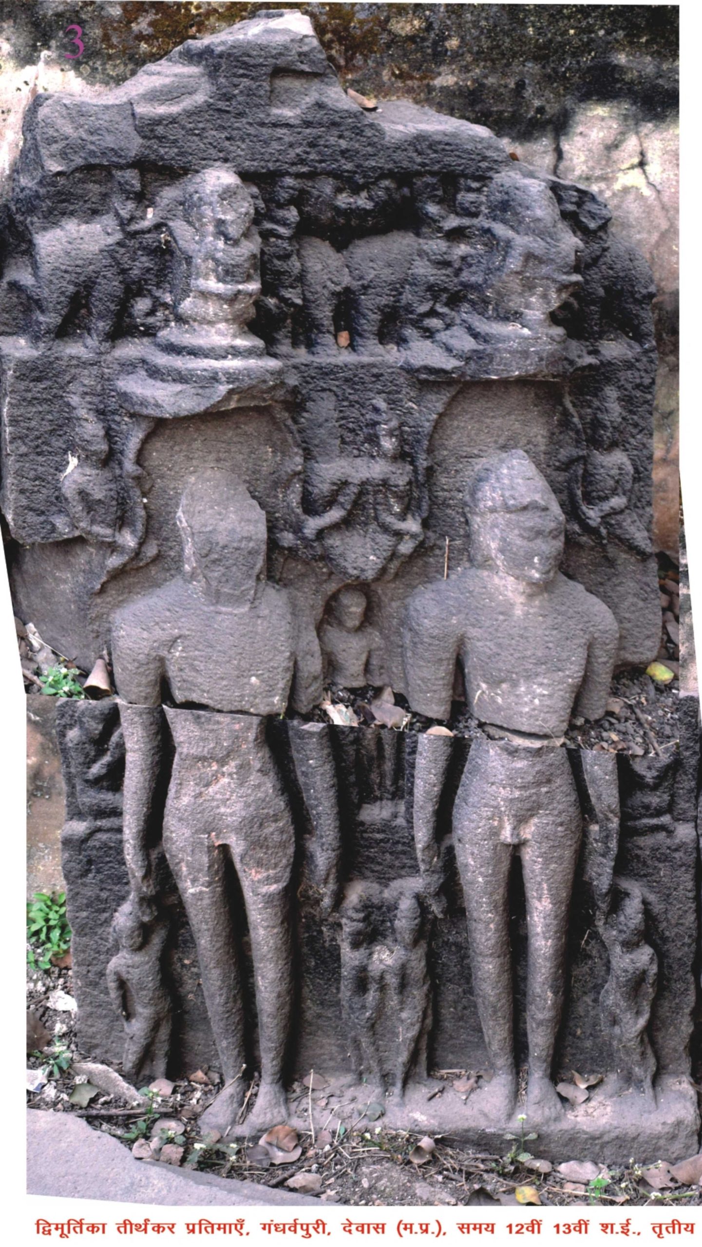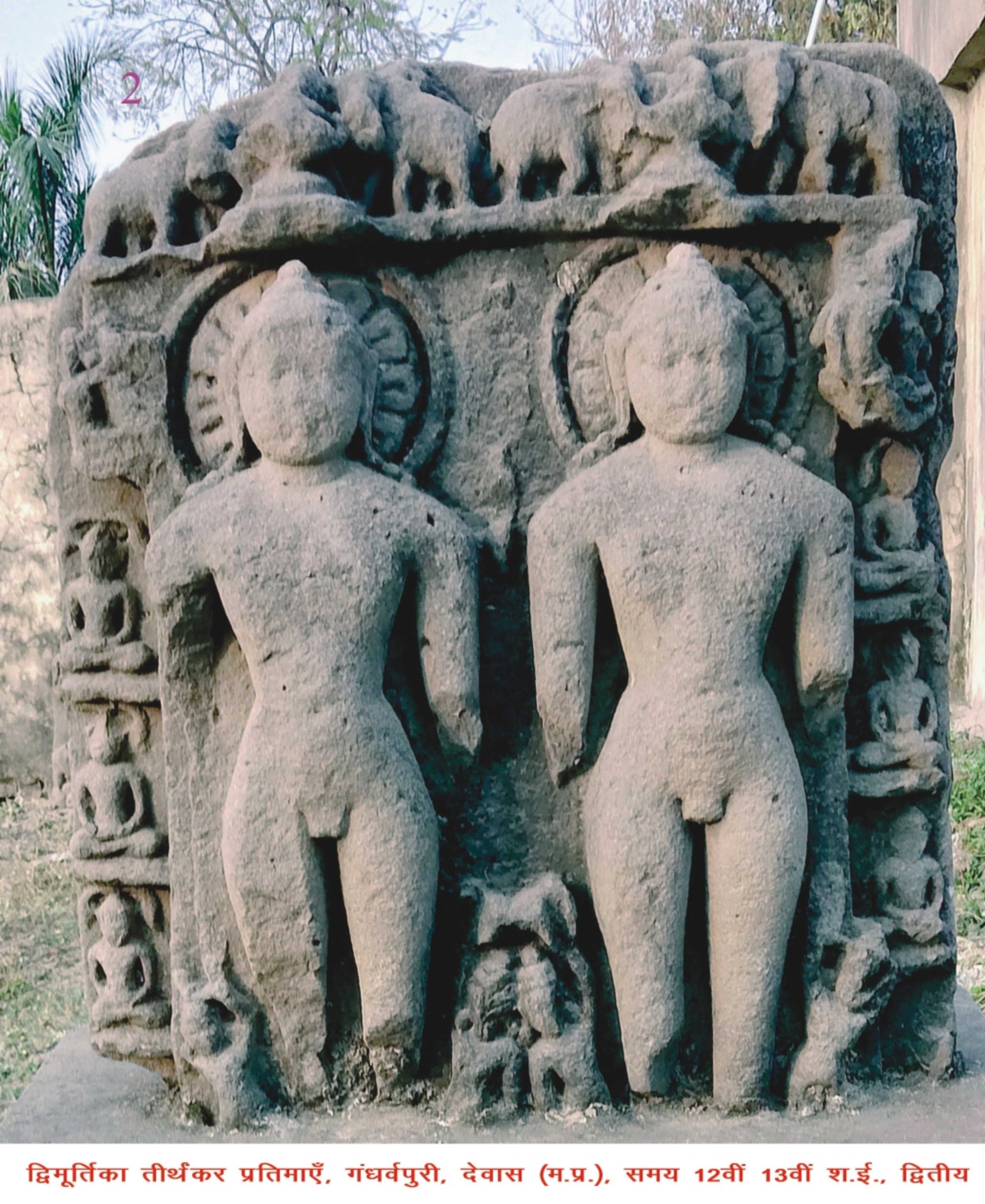 यह द्विमूर्तिका संभवतः लाने में खण्डित हो गई होगी, क्योंकि इसके अन्य खण्डित स्थानों की अपेक्षा शिला के दो भागों में टूटने के निशान अपेक्षाकृत नवीन हैं। गंधर्वपुरी के स्थानीय राजकीय संग्रहालय में इसके दोनों भाग पास-पास में रखे गये हैं। चित्र में हमने दनों भागों को मिलाकर एक दर्शाया है। इस द्विमूर्तिका का सबसे ऊपर का शिलाखण्ड खण्डित और अप्राप्त है। इस द्विमूर्तिका में भी चॅवरधारी, माल्यवाहक, छत्रत्रय, मृदंगवादक एकल – एकल देव और छत्रत्रय के दोनों ओर गजलक्ष्मी के गज सामान्य रूप से उत्कीर्णित हैं। इसमें विशेषता है कि दोनों प्रतिमाओं के किनारे की ओर के हाथ की कुहनी की बराबरी पर एक एक अंजलिबद्ध आराधक है और दोनों मुख्य प्रतिमाओं के मध्य एक कायोत्सर्ग लघु जिन उत्कीर्णित हैं।