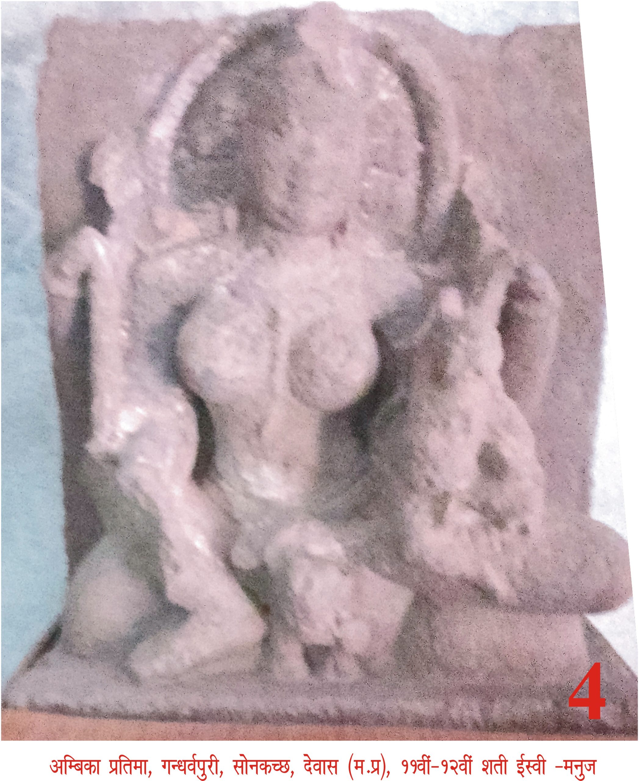 डॉ. नरेश पाठक जी ने यहां की एक भग्न अंबिका प्रतिमा का परिचय दिया है, आलेख लिखते समय उनकी दृष्टि में अन्य अम्बिका प्रतिमाएं आईं नहीं होंगी या संकलित ही नहीं हुईं होंगी। दिनांक 31 दिसम्बर 2023 को ‘श्री राष्ट्रीय जैन प्राच्यविद्या अनुसंधान संगठन’ की टीम के अन्तर्गत हम शोध-सर्वेक्षण हेतु गंधर्वपुरी पहुँचे थे और वहां के फोटोग्राफ तथा अन्य विवरण लिये। इन प्रतिमाओं के छायाचित्र जब हमने सूक्ष्मता से देखे तो यहाँ हमें वहां की छः अम्बिका प्रतिमाएं मिलीं, जिनमें दो खंडित थीं एक का उदर से ऊपर का भाग और एक का अधोभाग। हमने कम्प्यूटर पर जब दोनों खण्डों को मिलाय तब ये एक ही प्रतिमा के दोनों भाग परिलक्षित होते हैं। इसी के ऊपरी भाग का उल्लेख पाठक जी ने अपने ग्रन्थ में किया है।