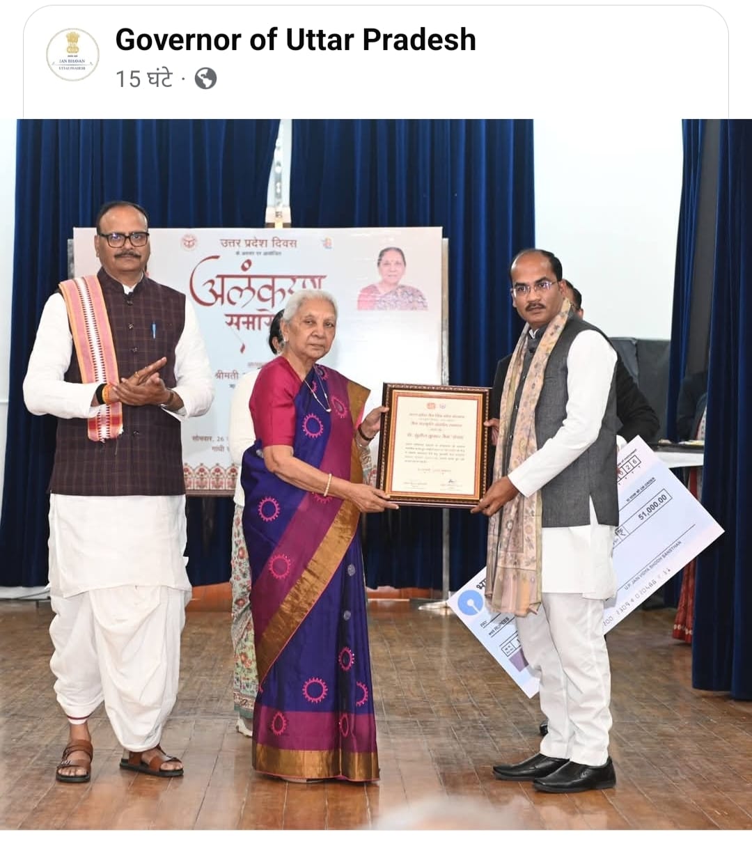 महामहिम राज्यपाल ने डॉ. सुनील जैन संचय को प्रशस्ति पत्र, ₹51,000 की सम्मान राशि का चेक एवं शाल भेंट कर सम्मानित किया।